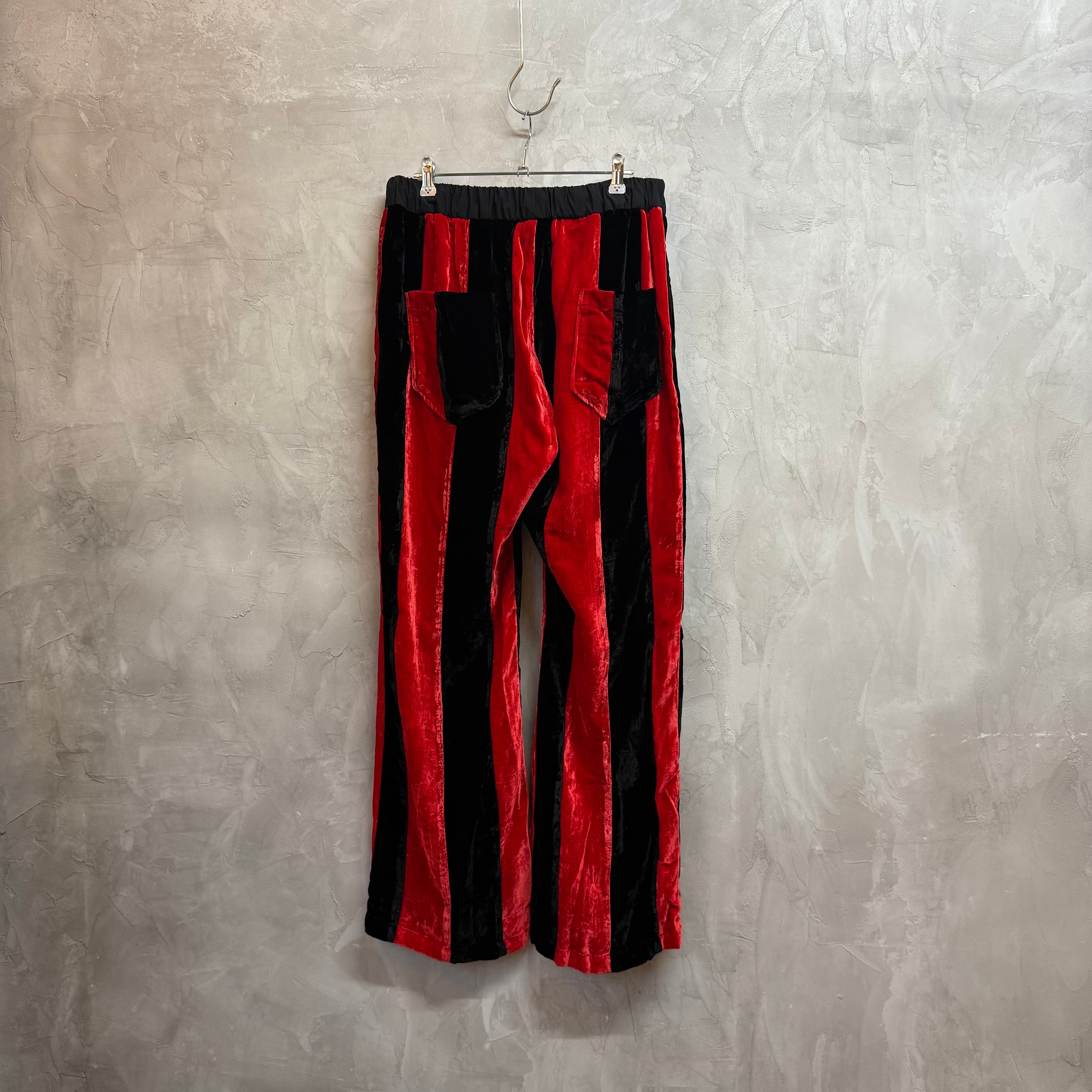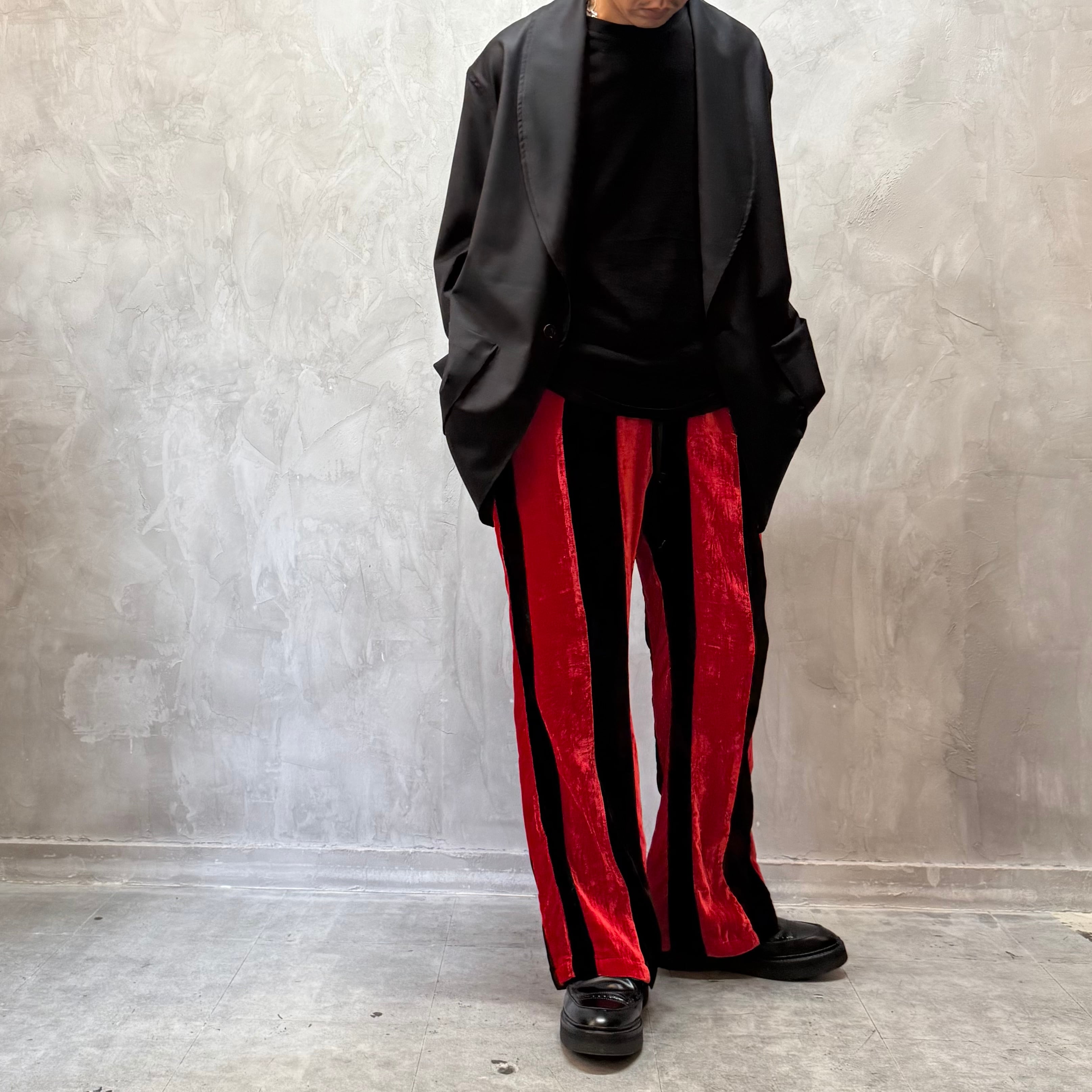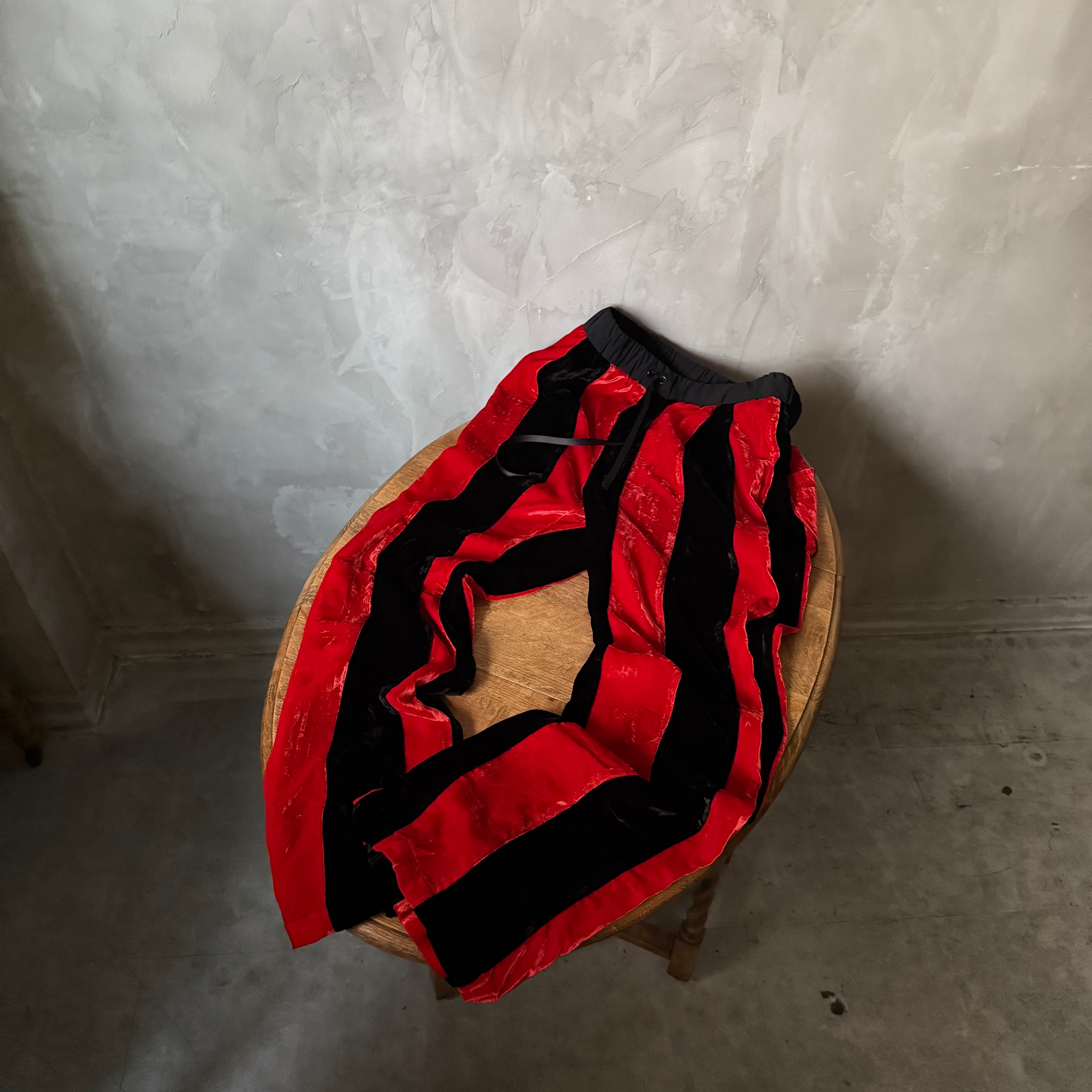2色のベロアを帯状に裁断し、一枚ずつ丁寧に繋ぎ合わせてストライプを描き出すところから始めました