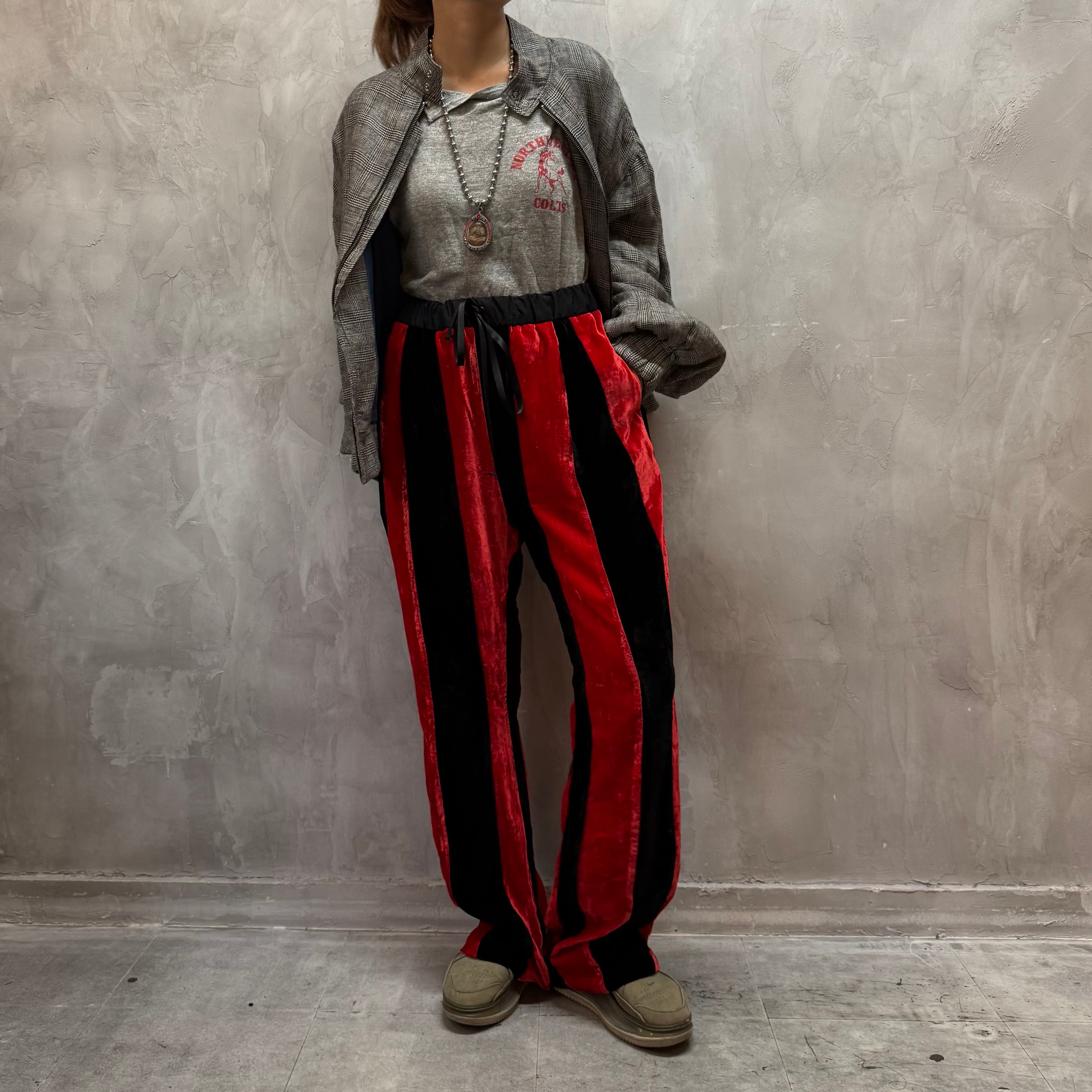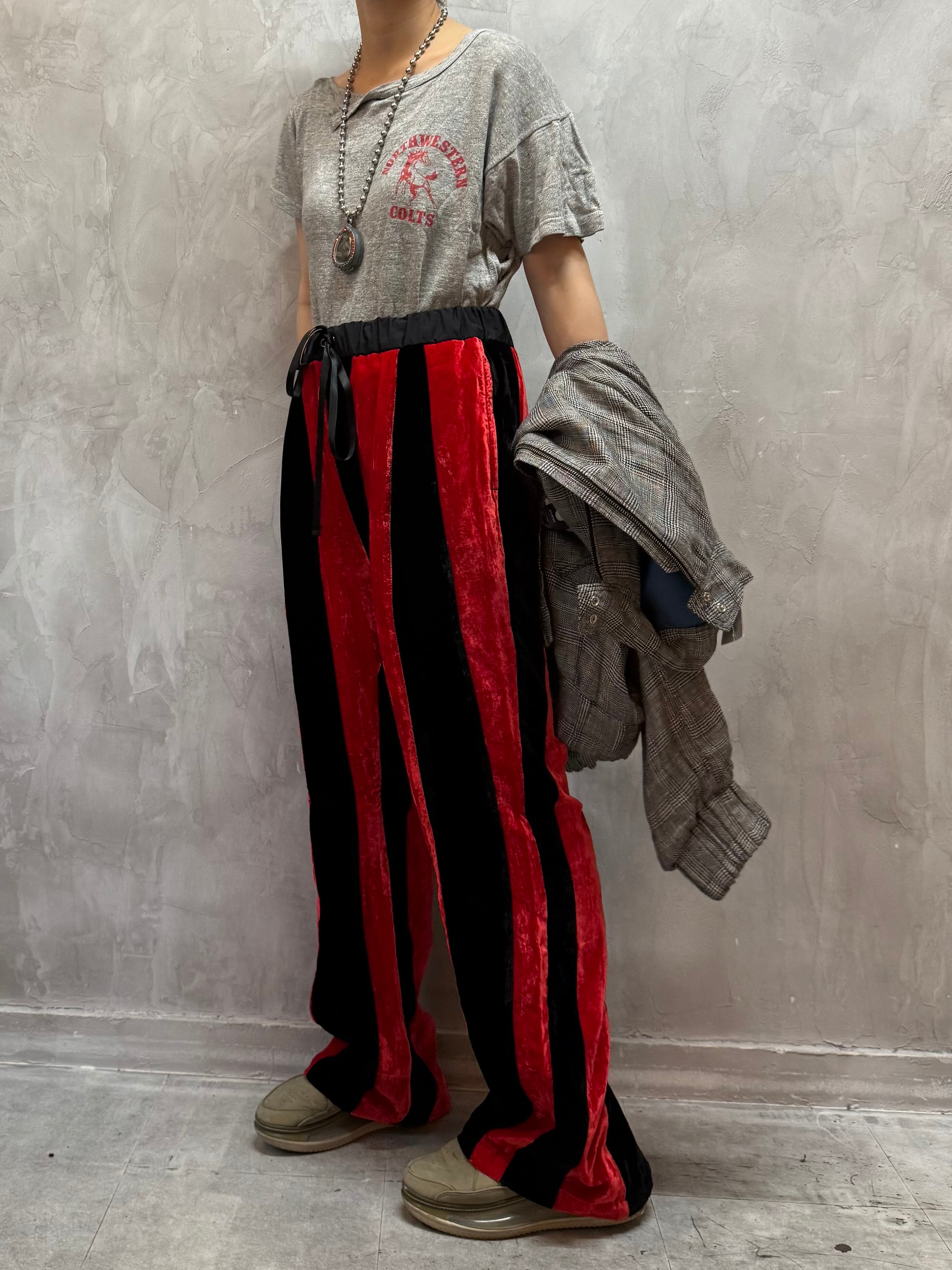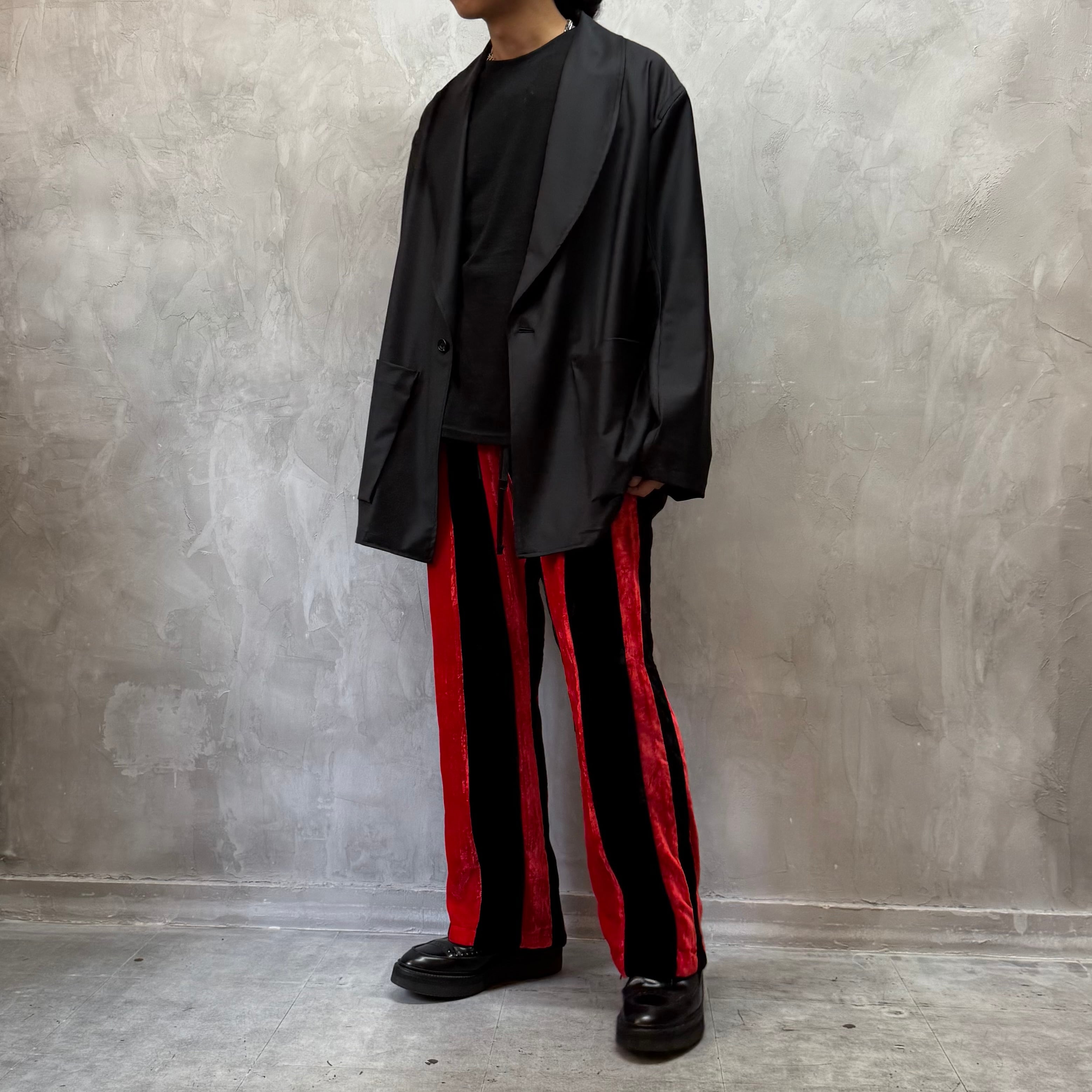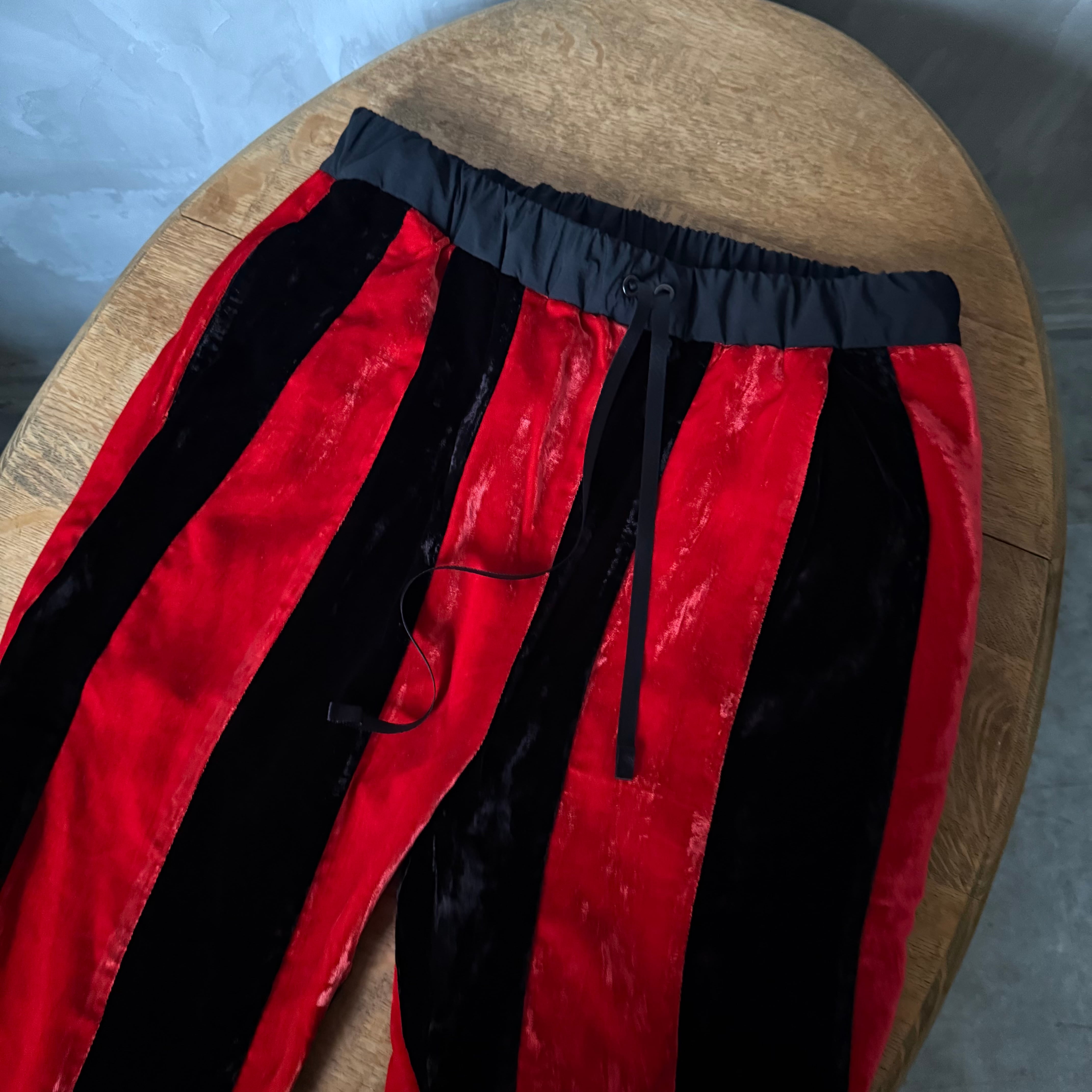 2色のベロアを帯状に裁断し、一枚ずつ丁寧に繋ぎ合わせてストライプを描き出すところから始めました