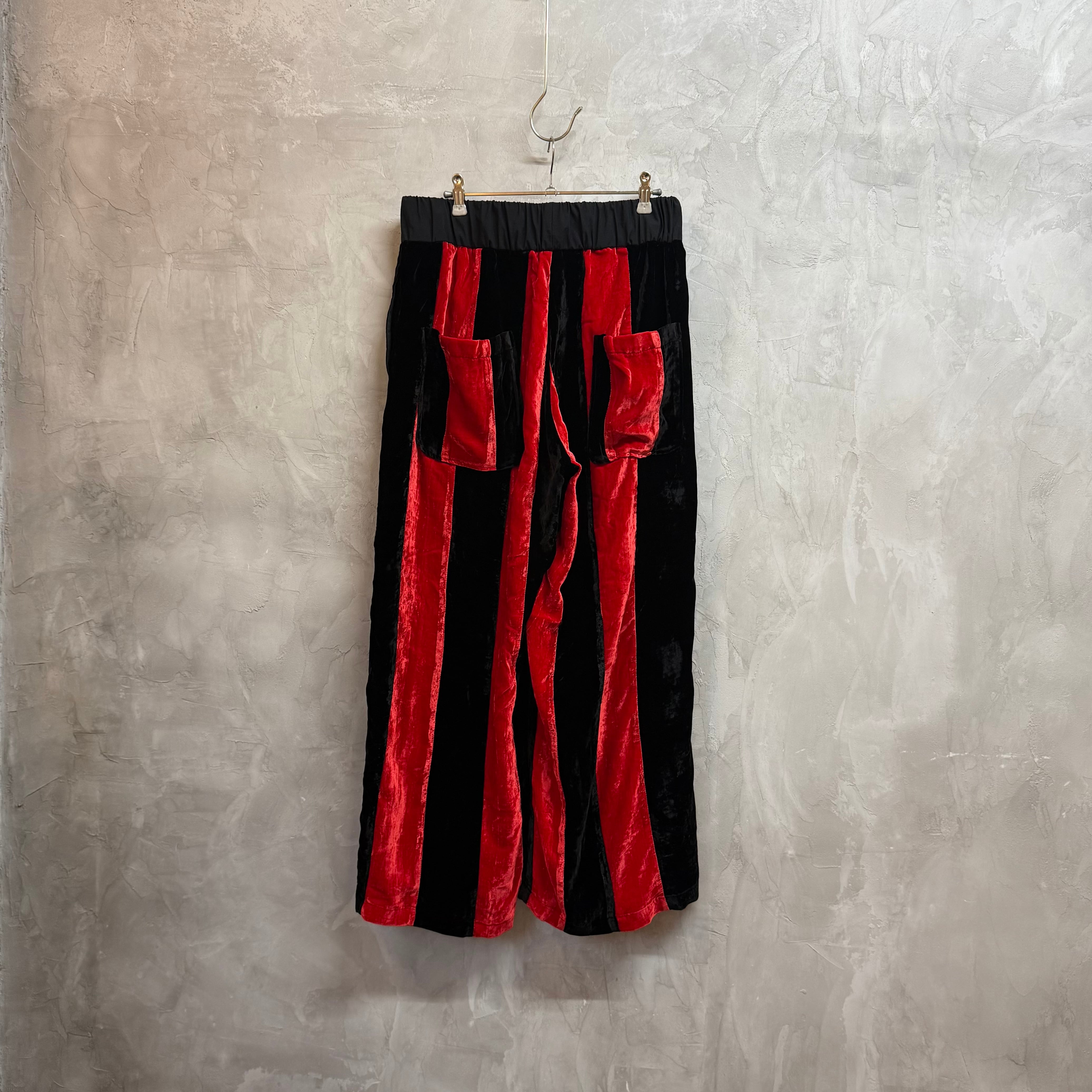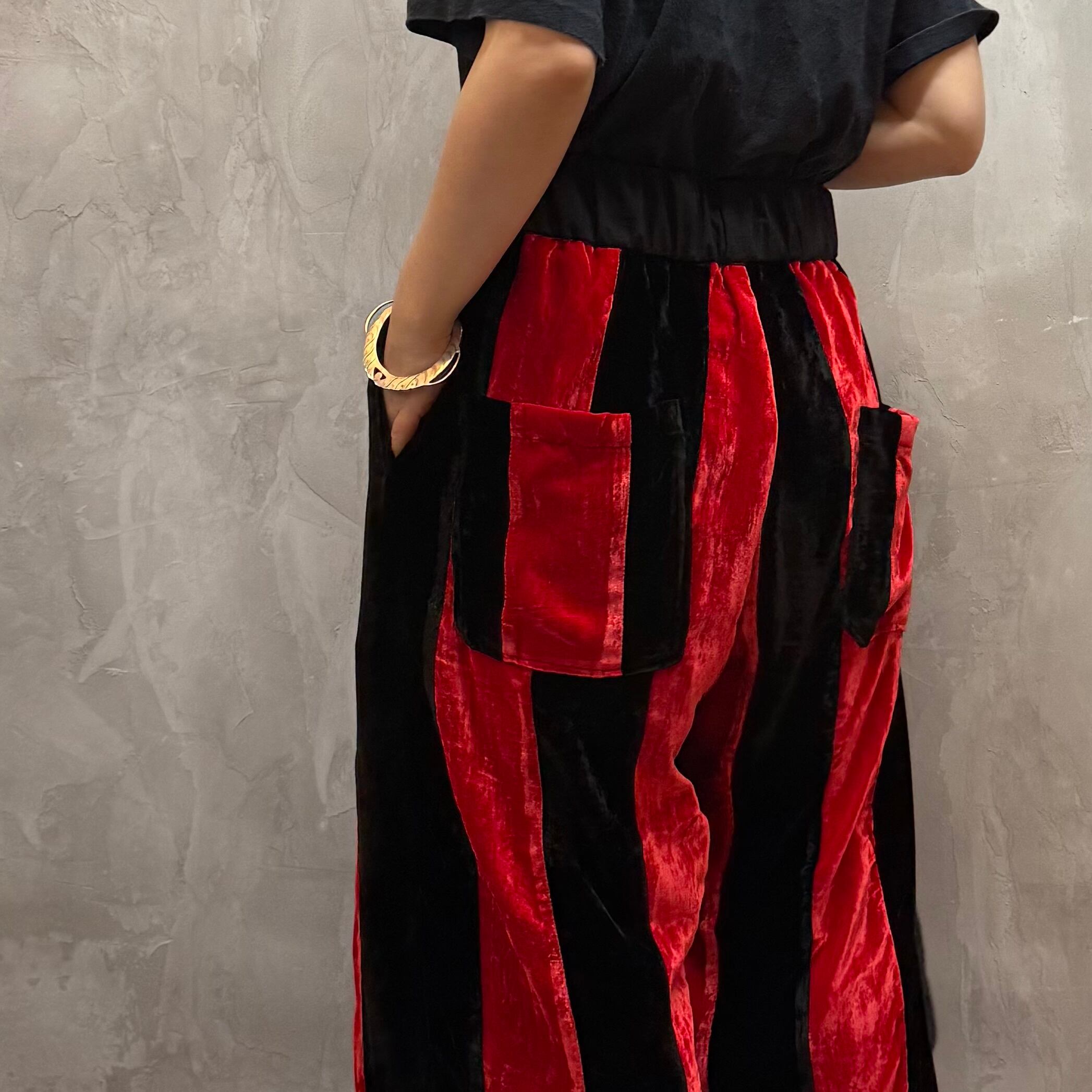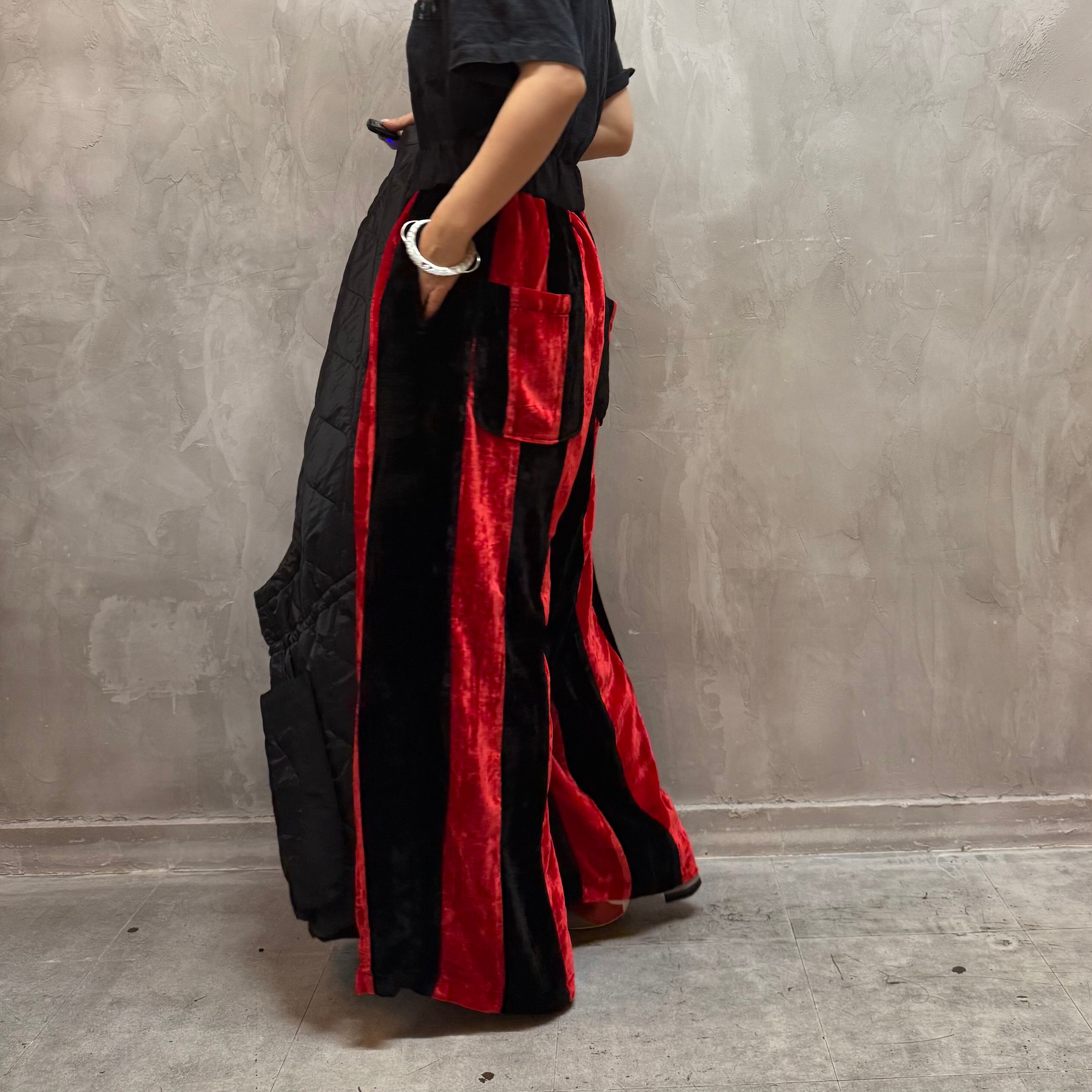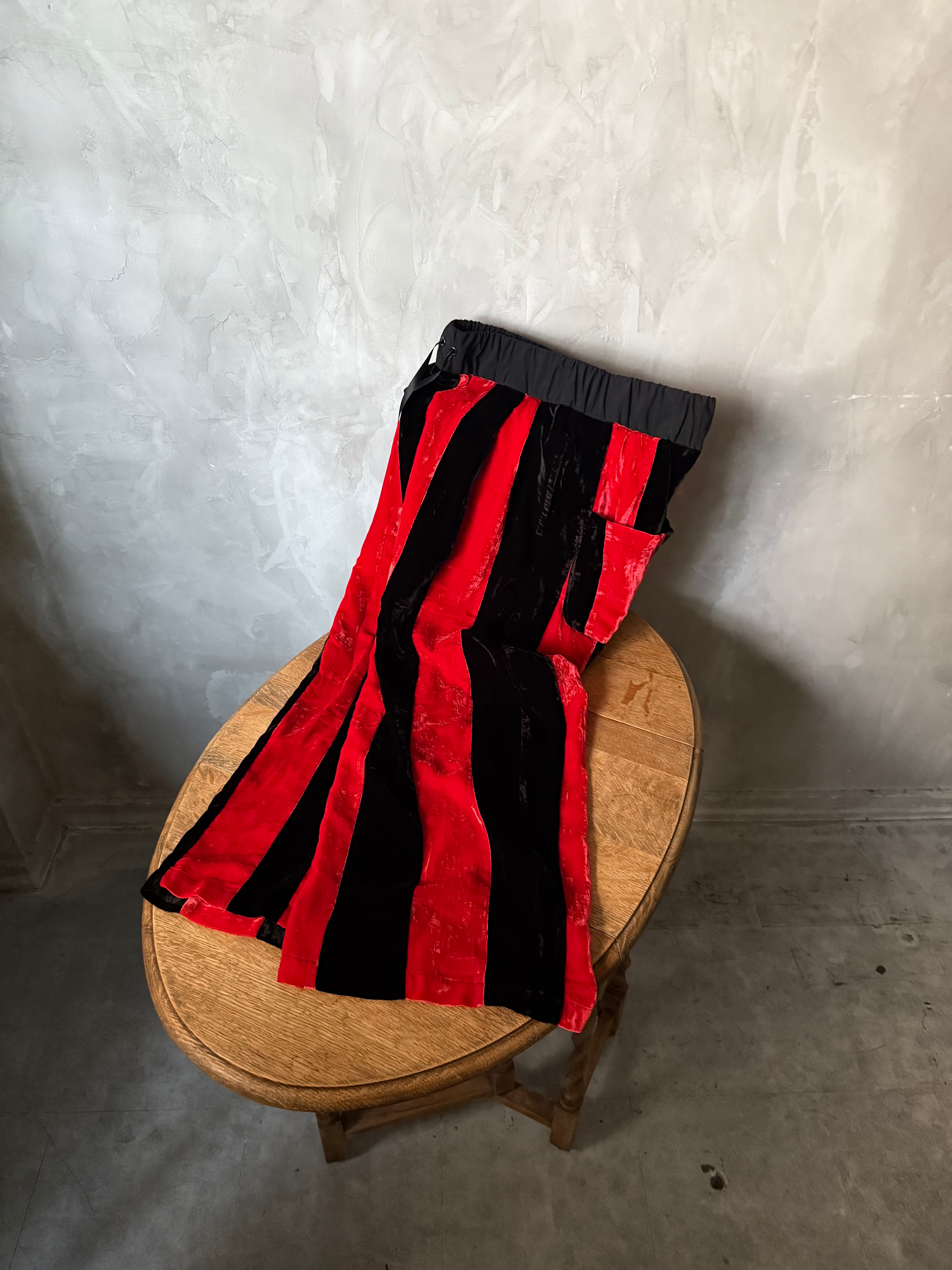 2色のベロアを帯状に裁断し、一枚ずつ丁寧に繋ぎ合わせてストライプを描き出すところから始めました