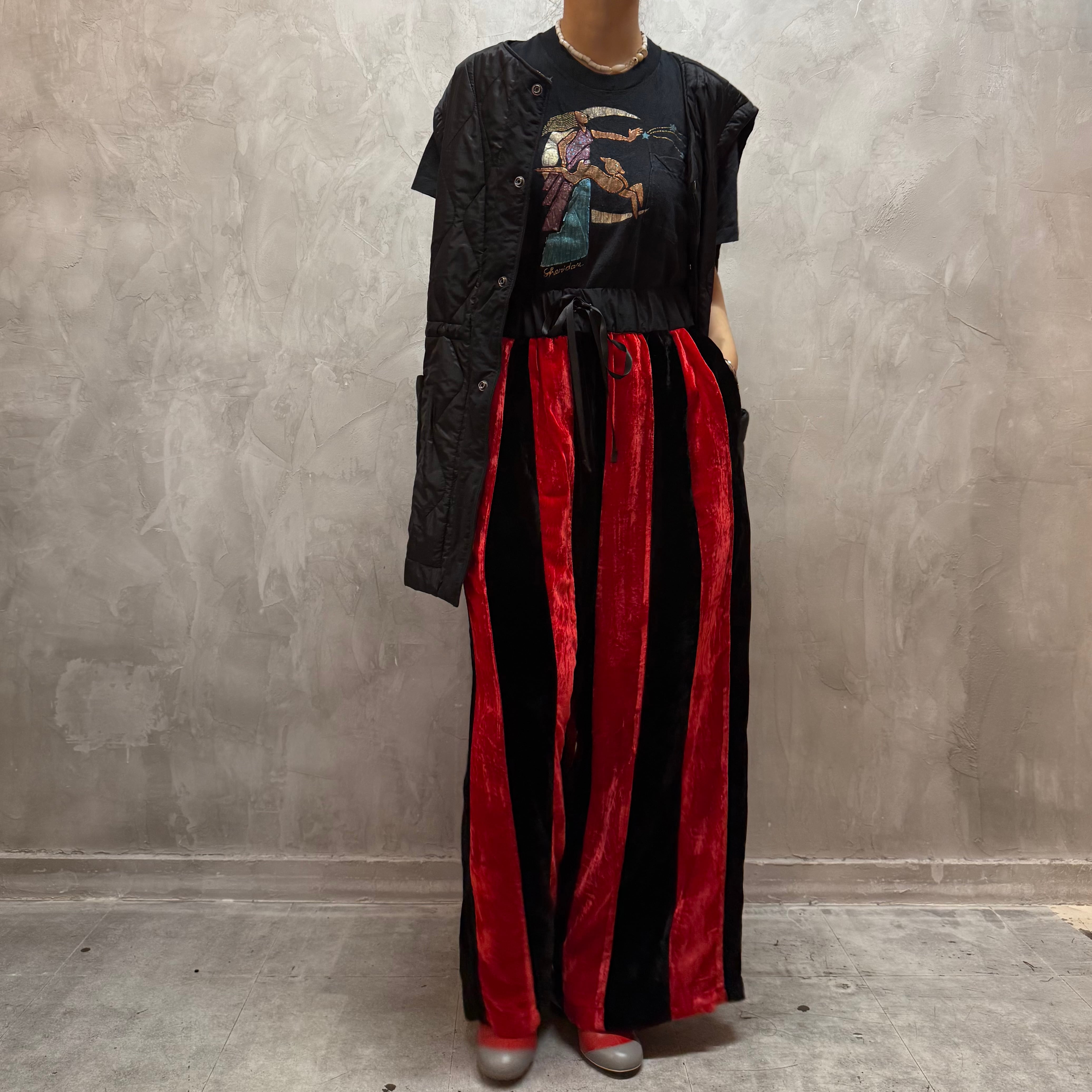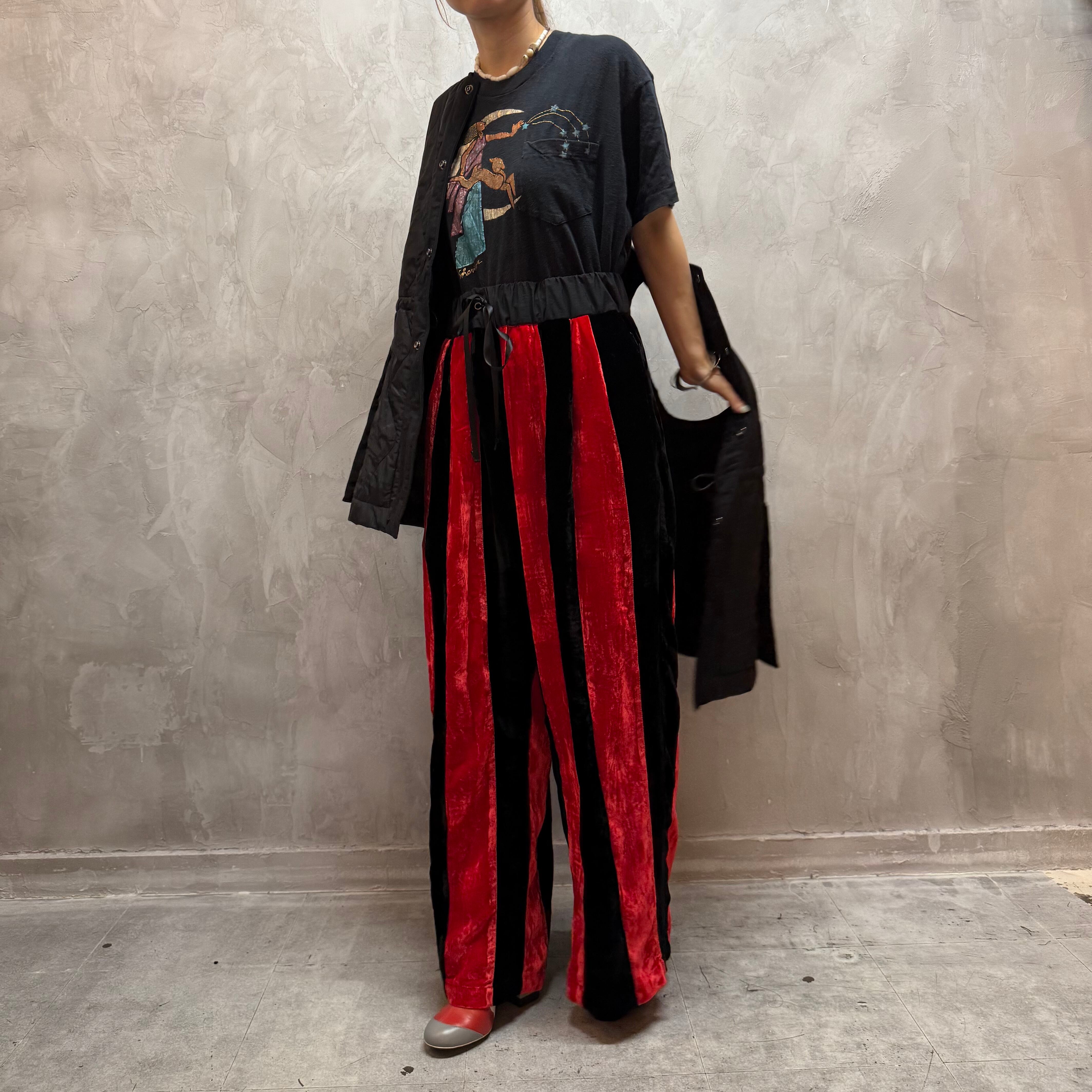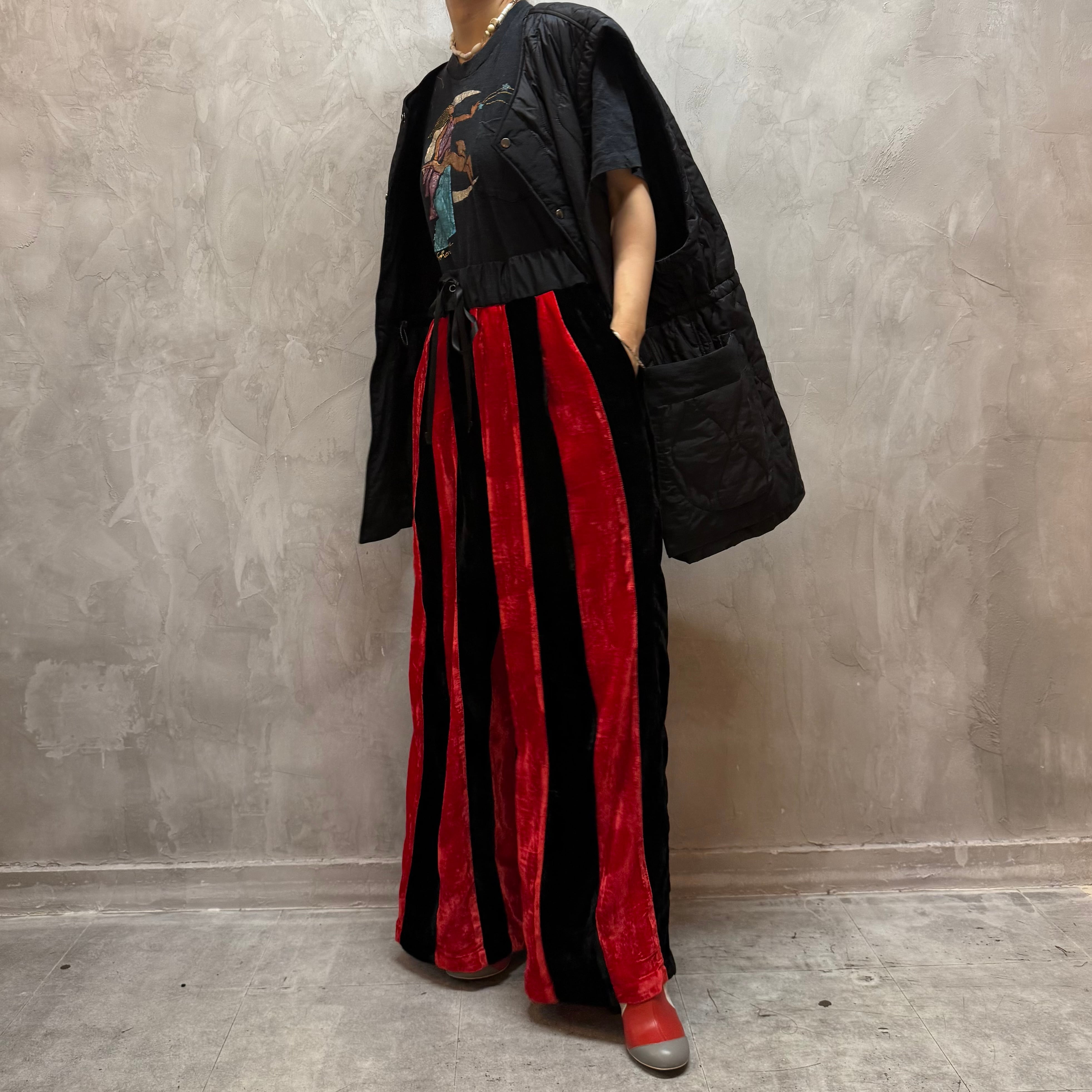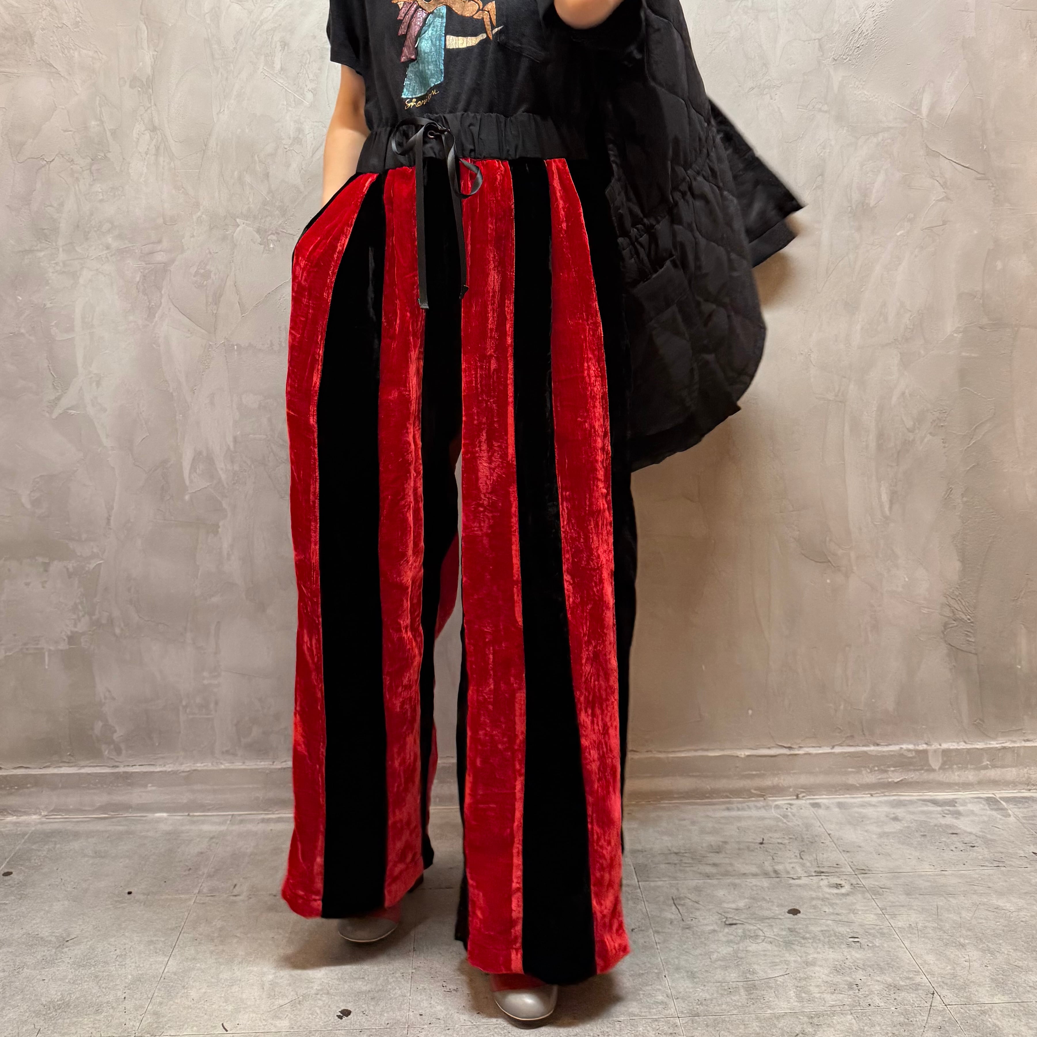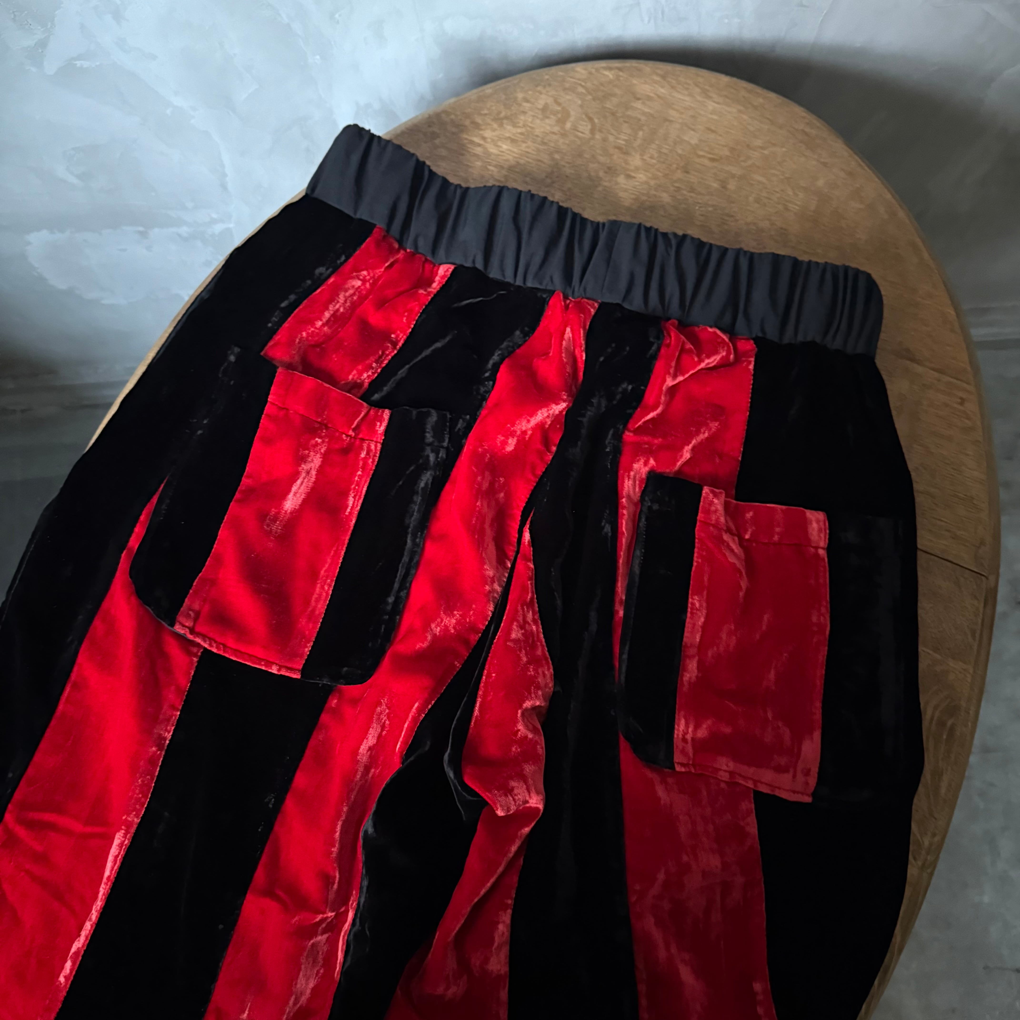 2色のベロアを帯状に裁断し、一枚ずつ丁寧に繋ぎ合わせてストライプを描き出すところから始めました