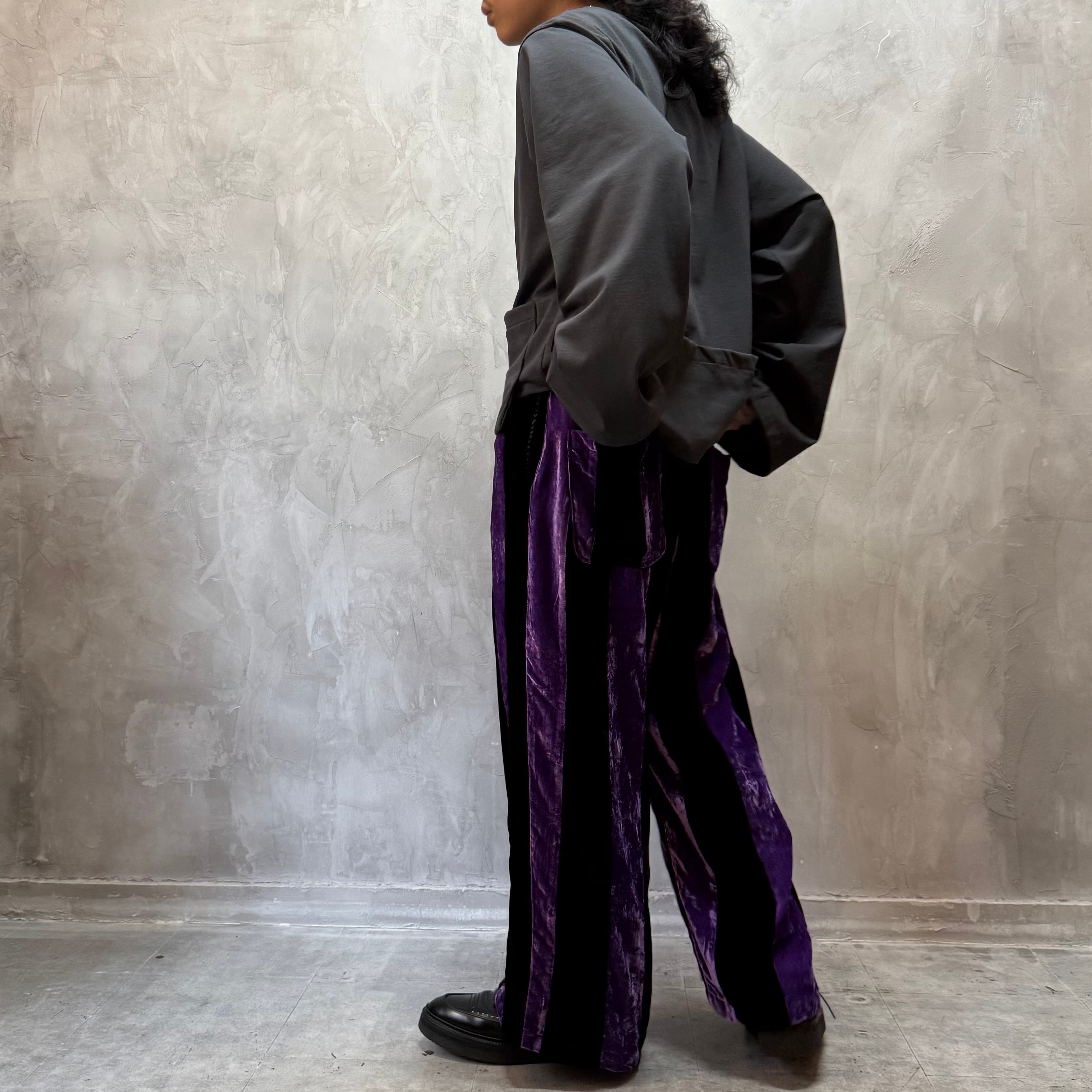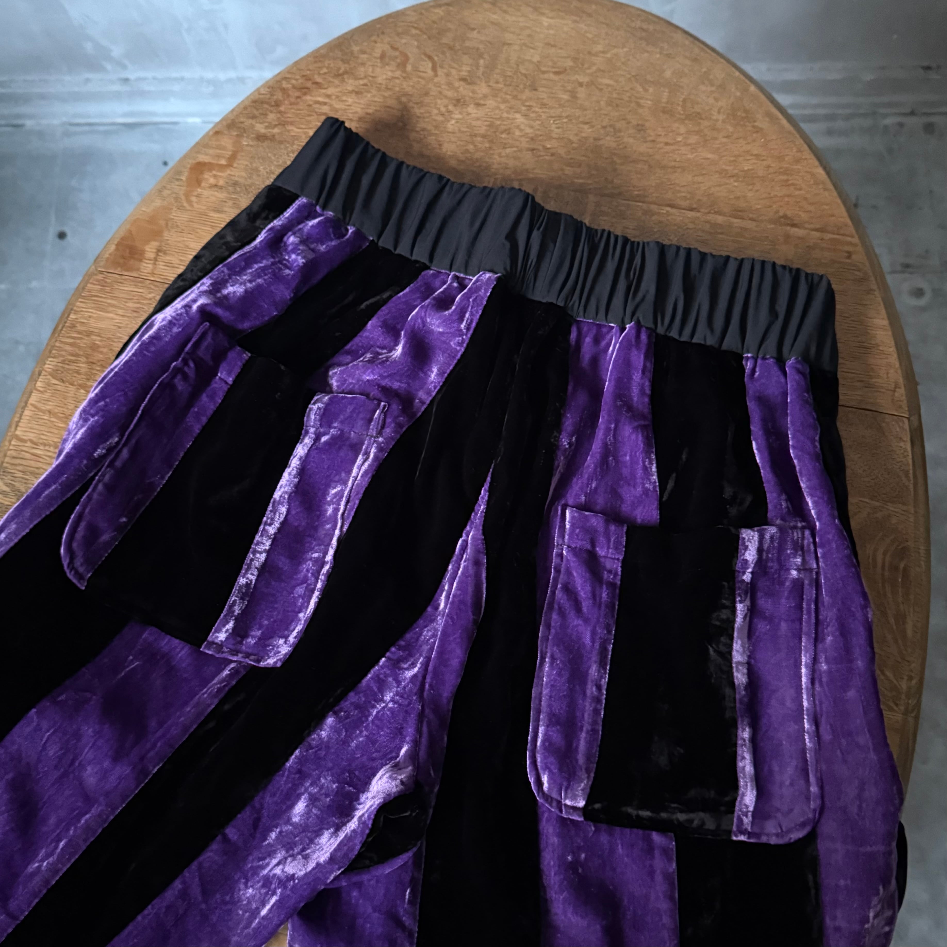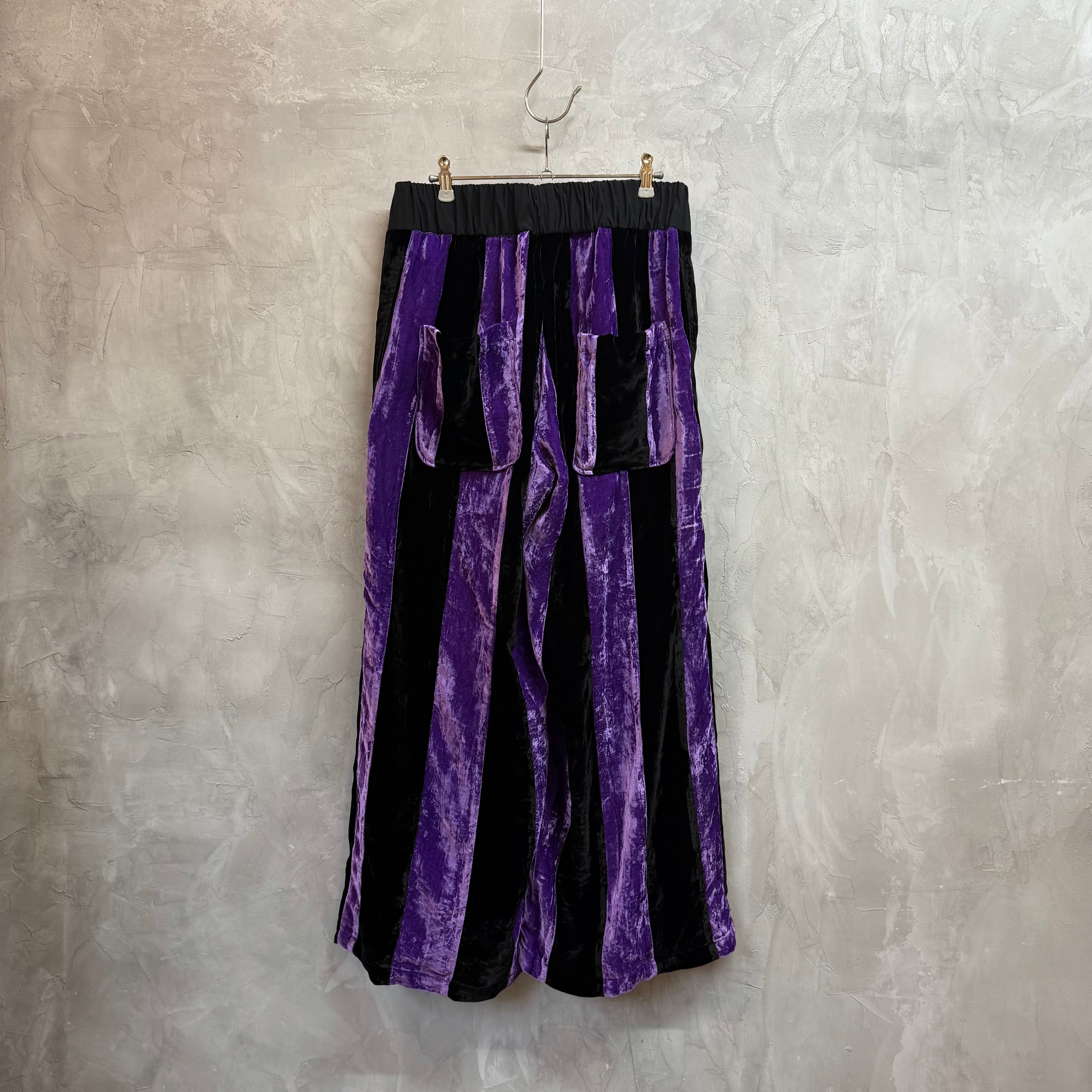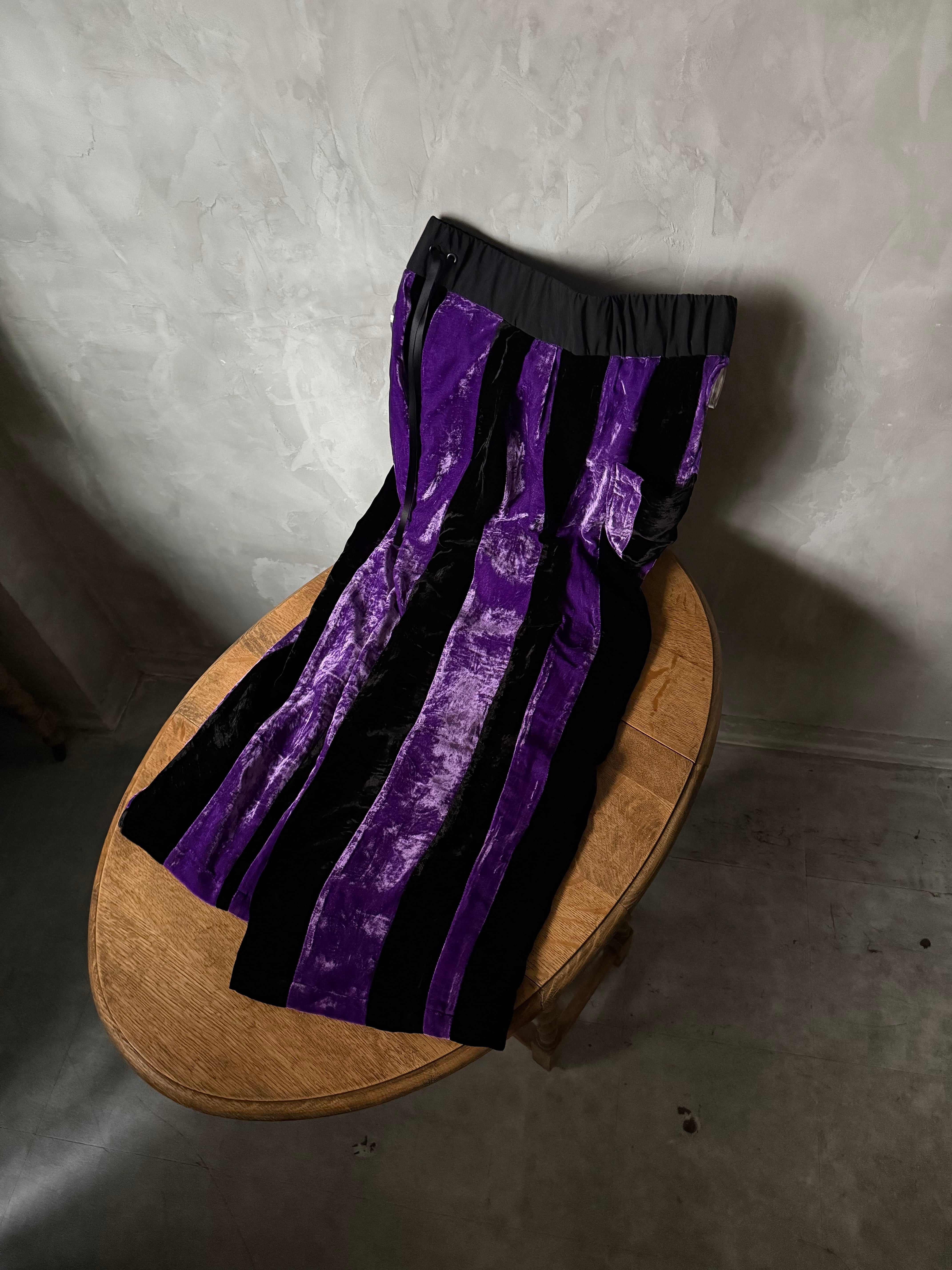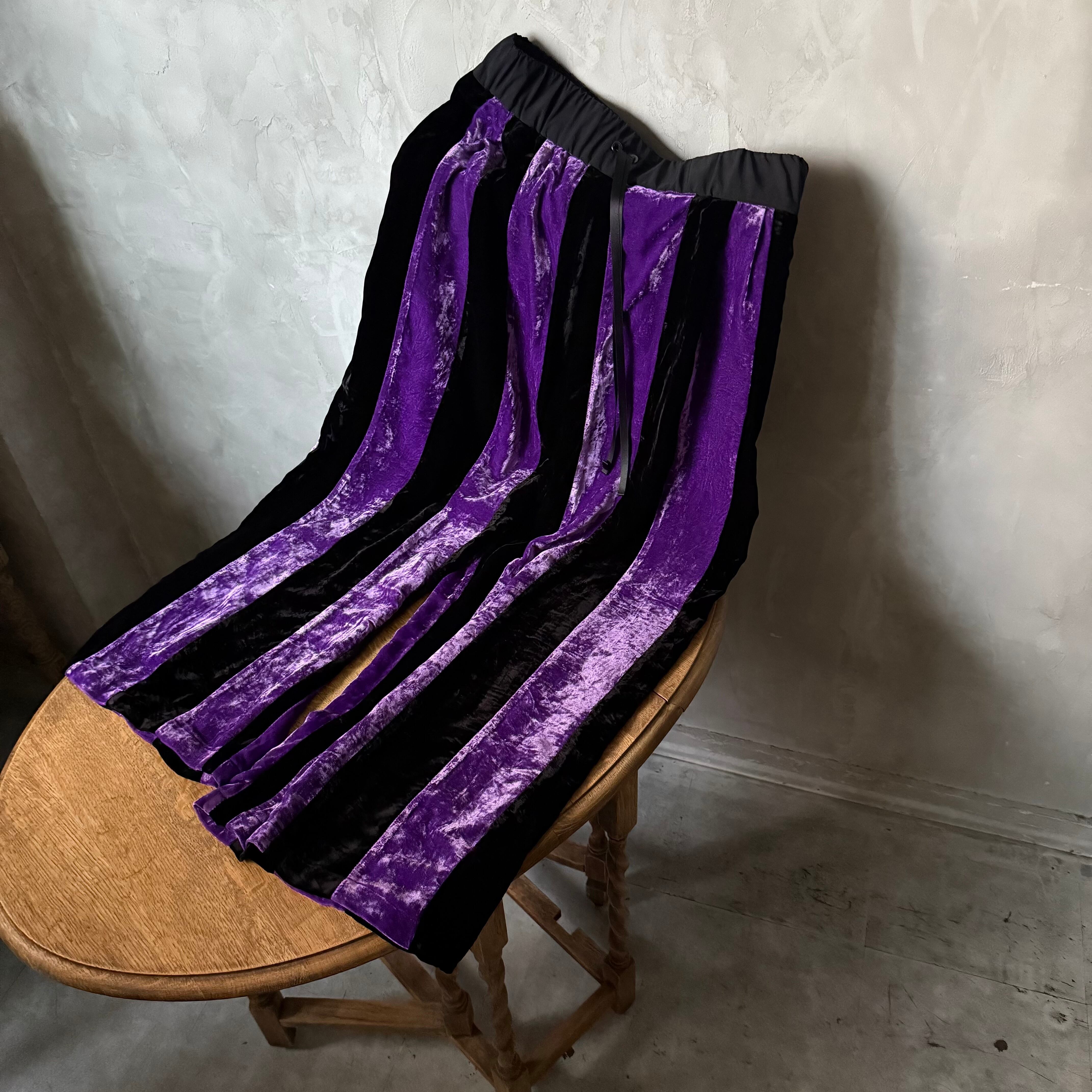 2色のベロアを帯状に裁断し、一枚ずつ丁寧に繋ぎ合わせてストライプを描き出すところから始めました