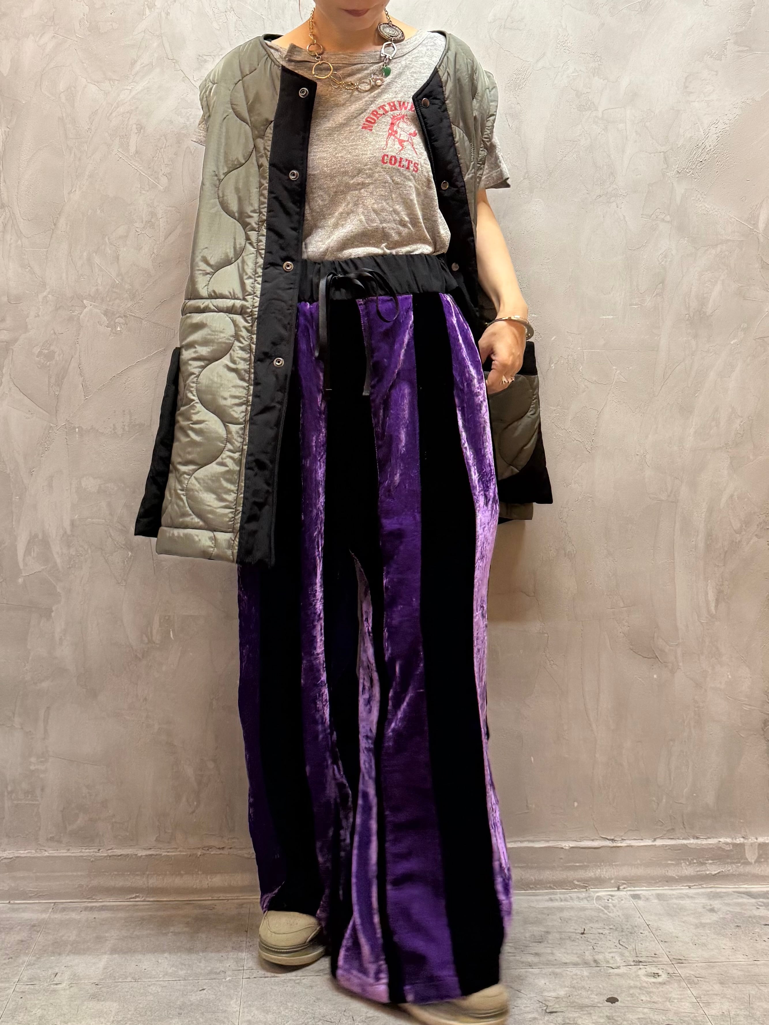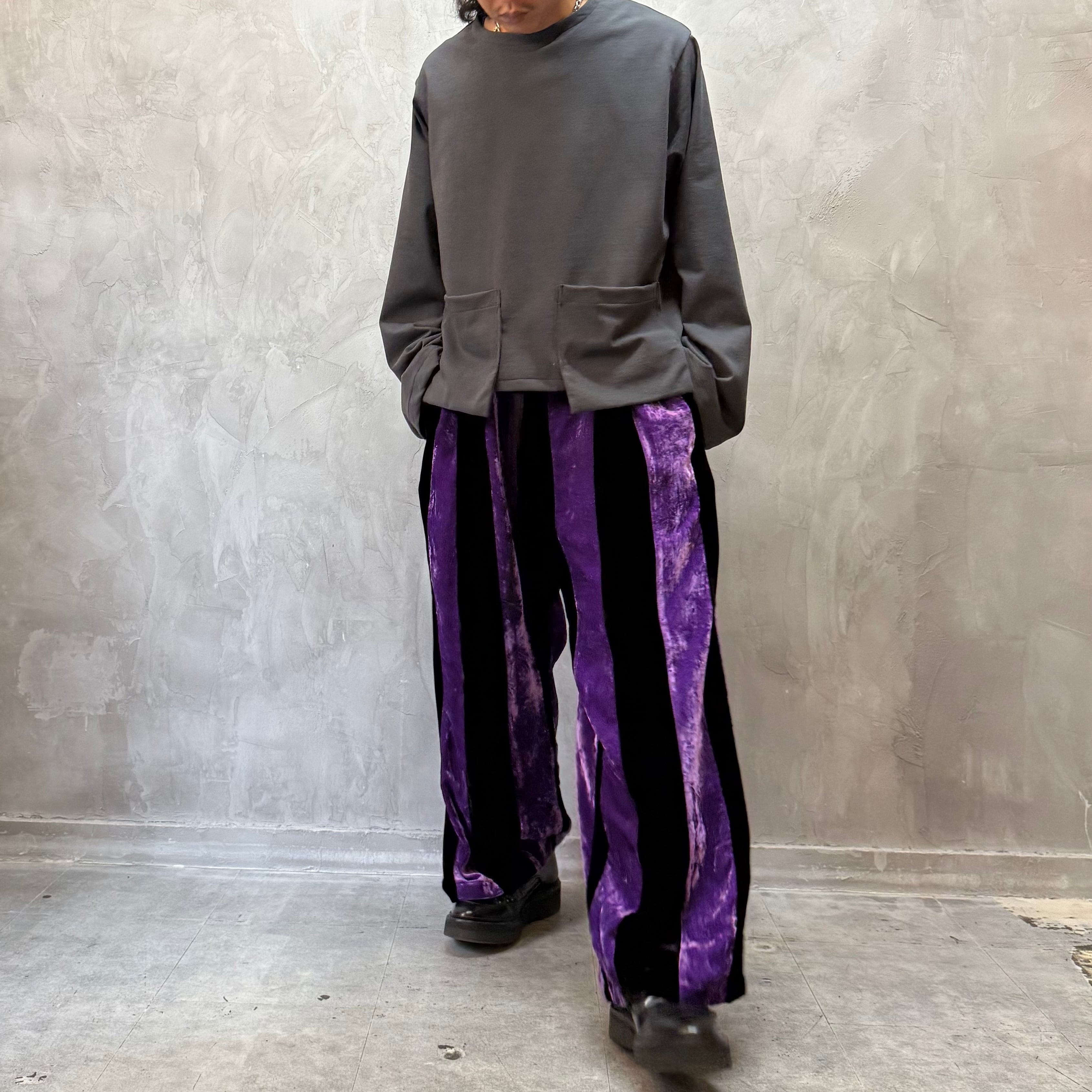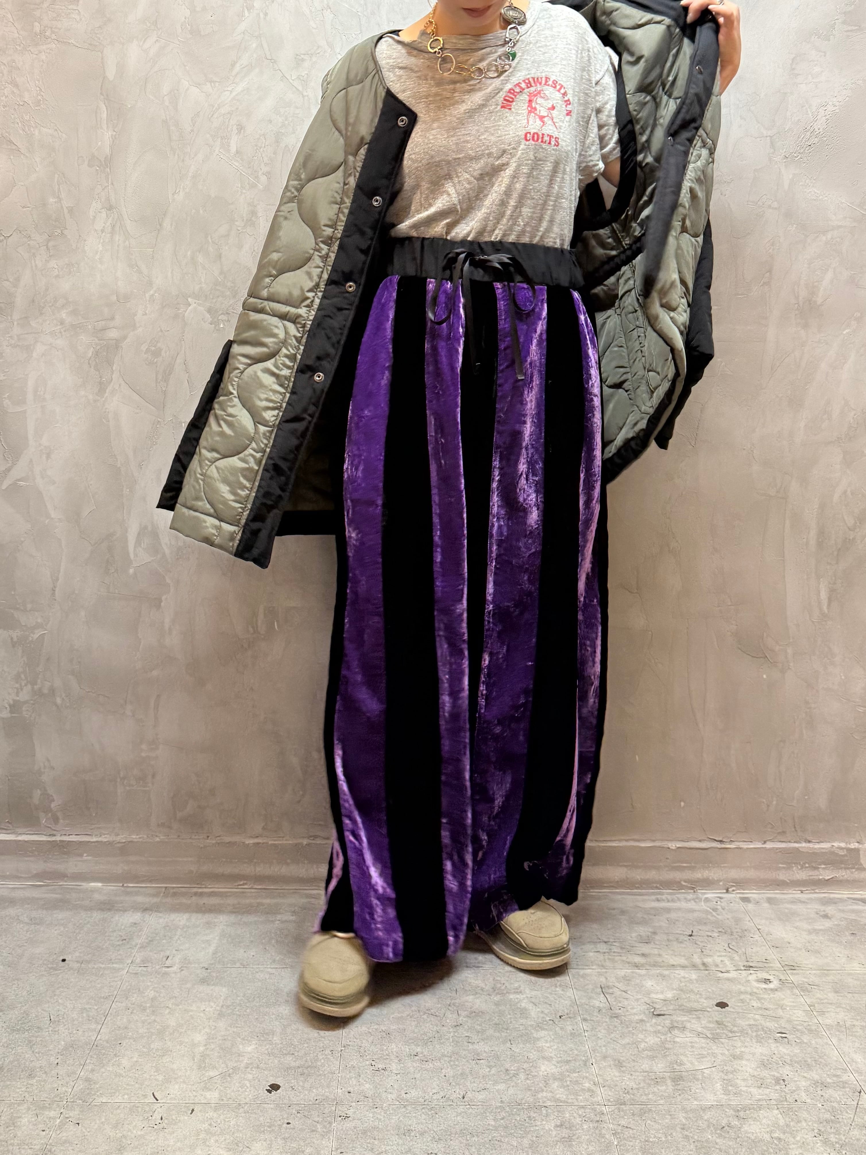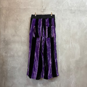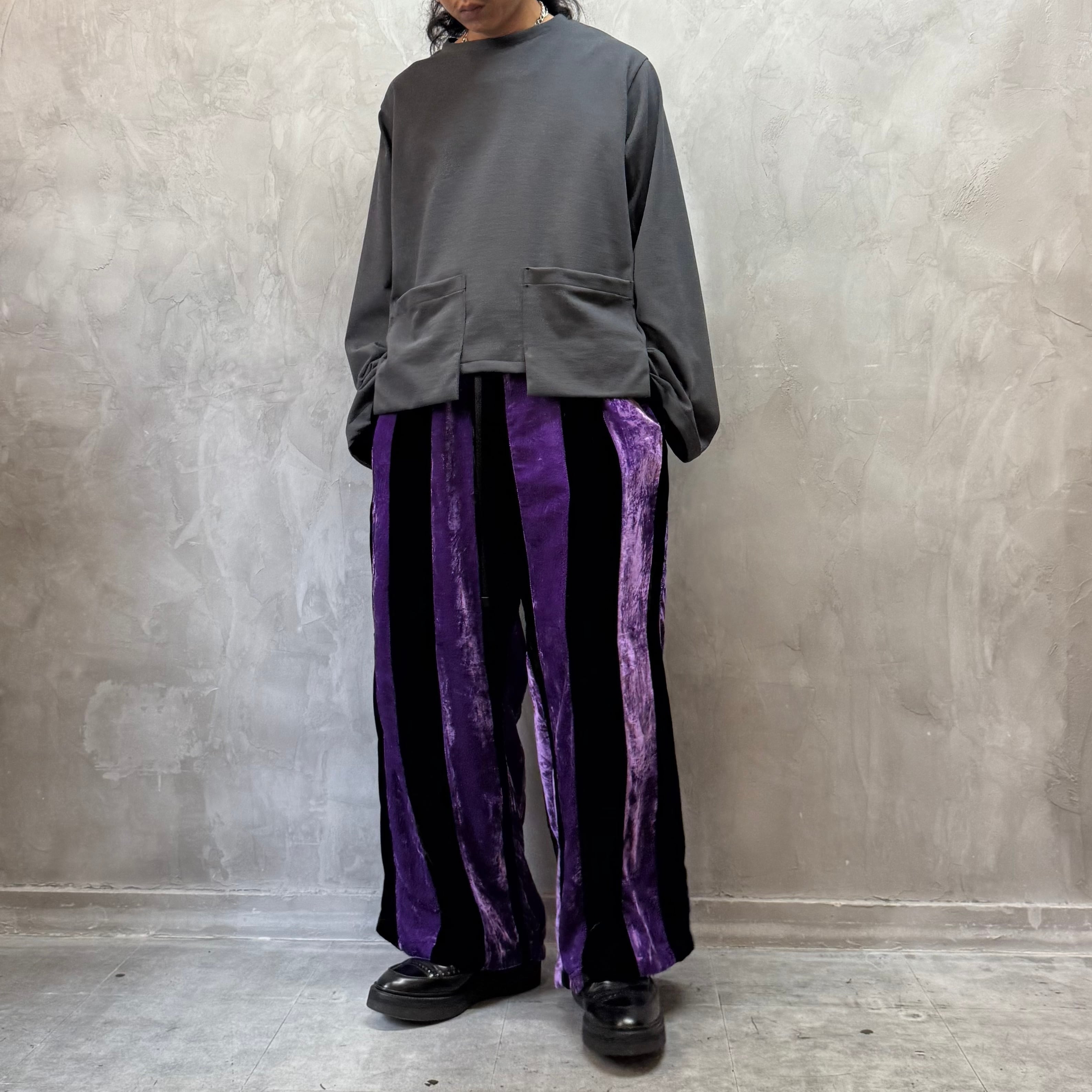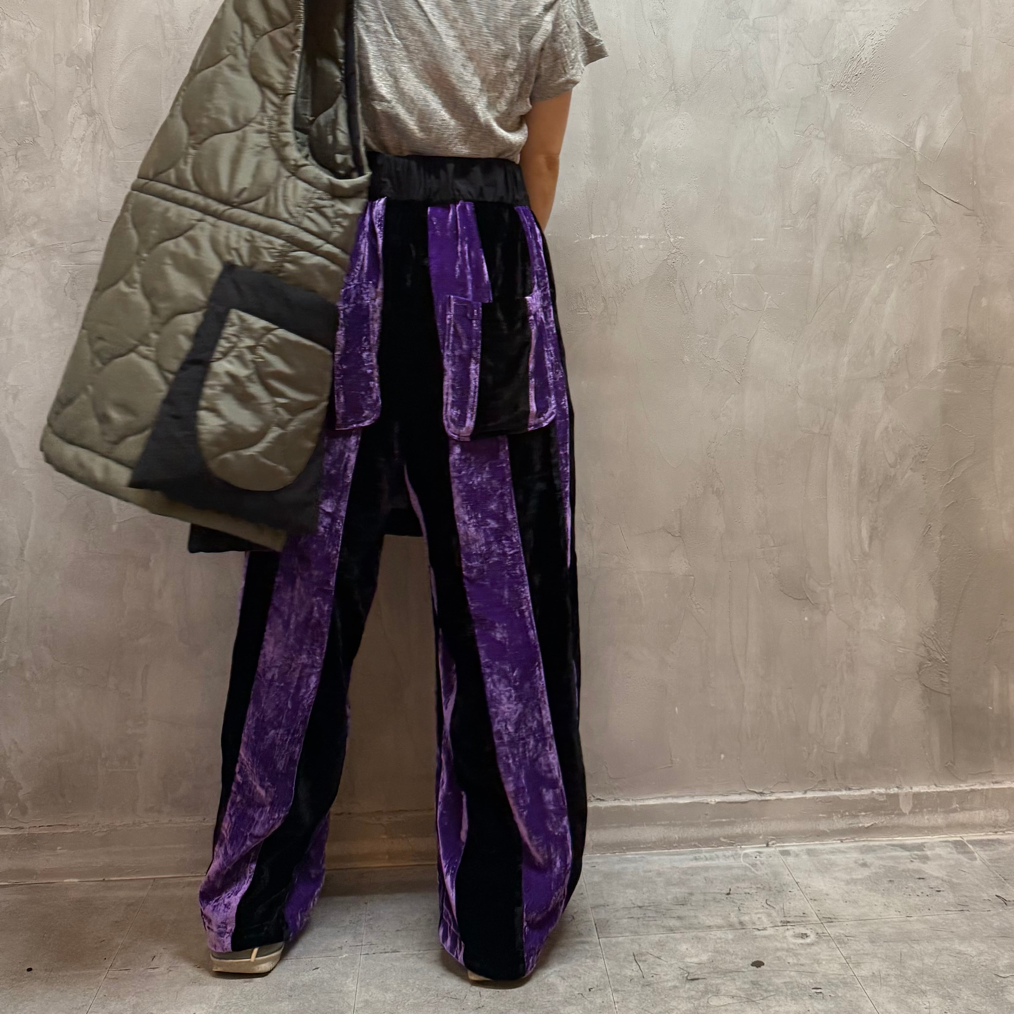 2色のベロアを帯状に裁断し、一枚ずつ丁寧に繋ぎ合わせてストライプを描き出すところから始めました