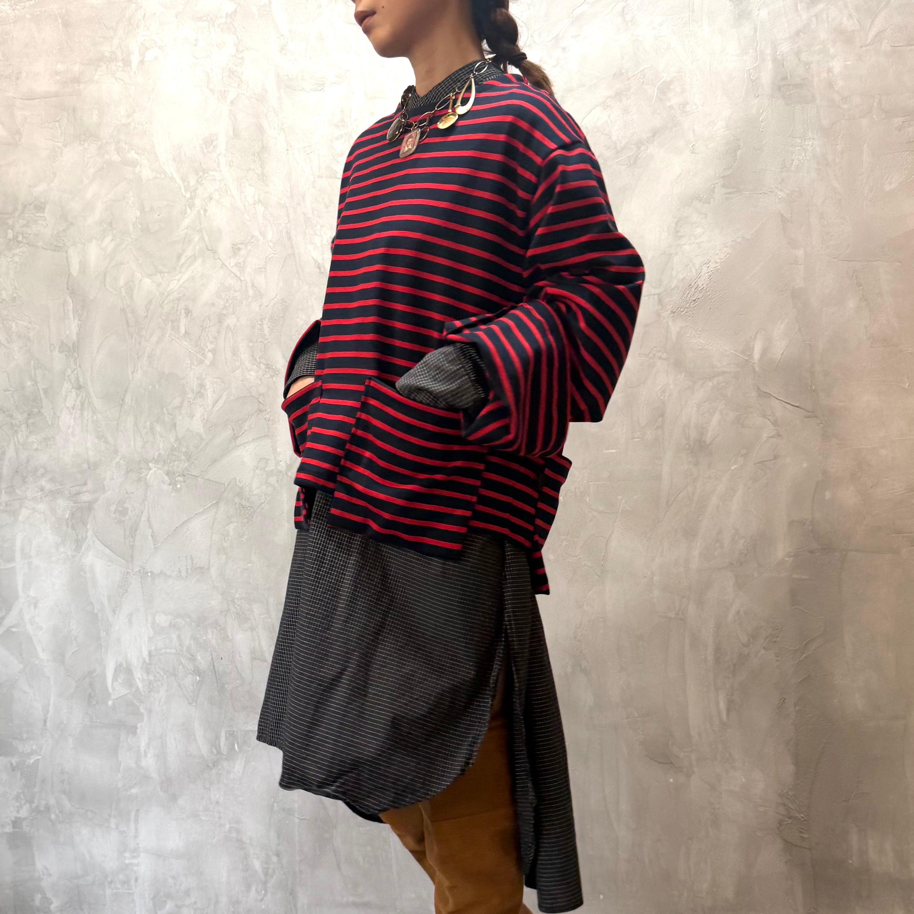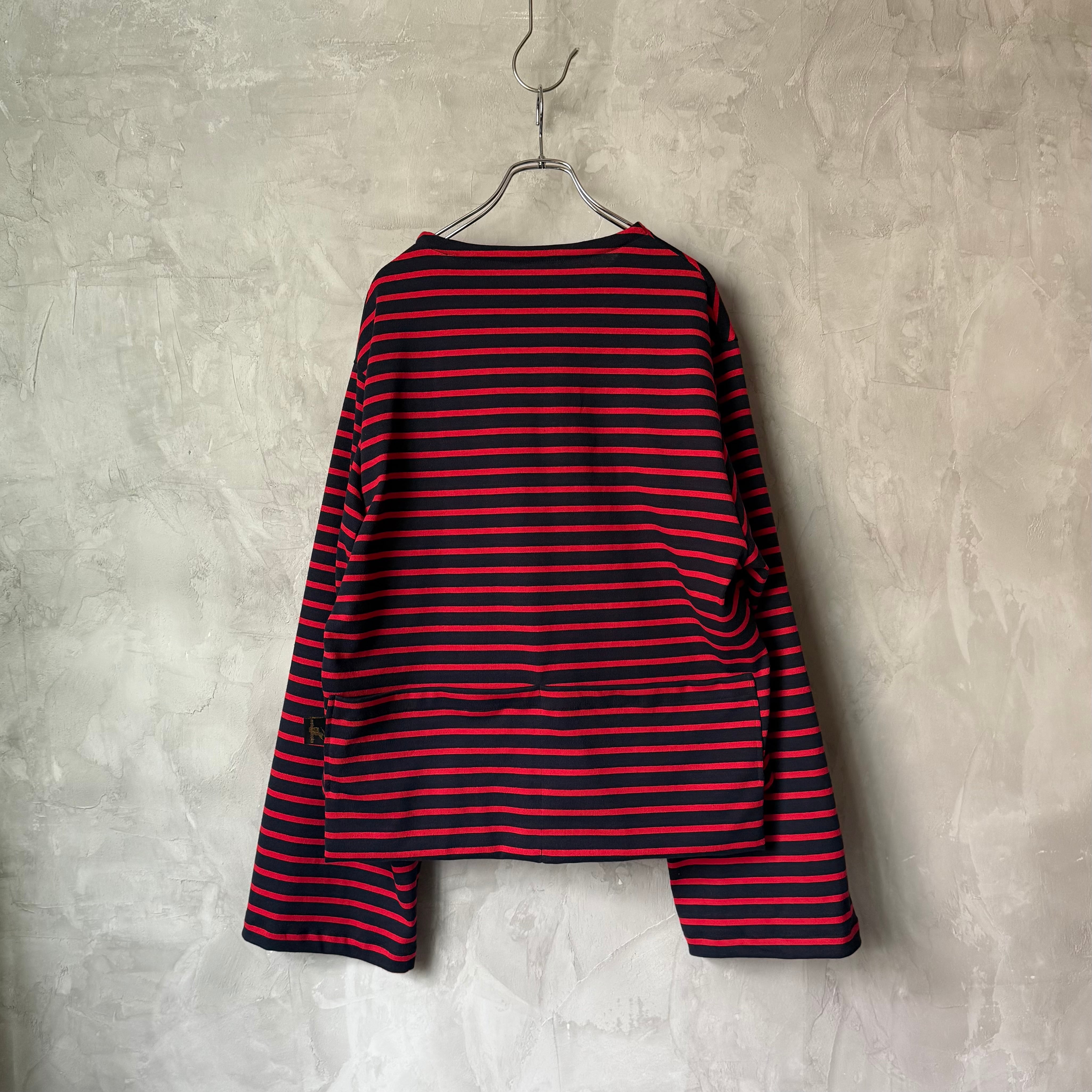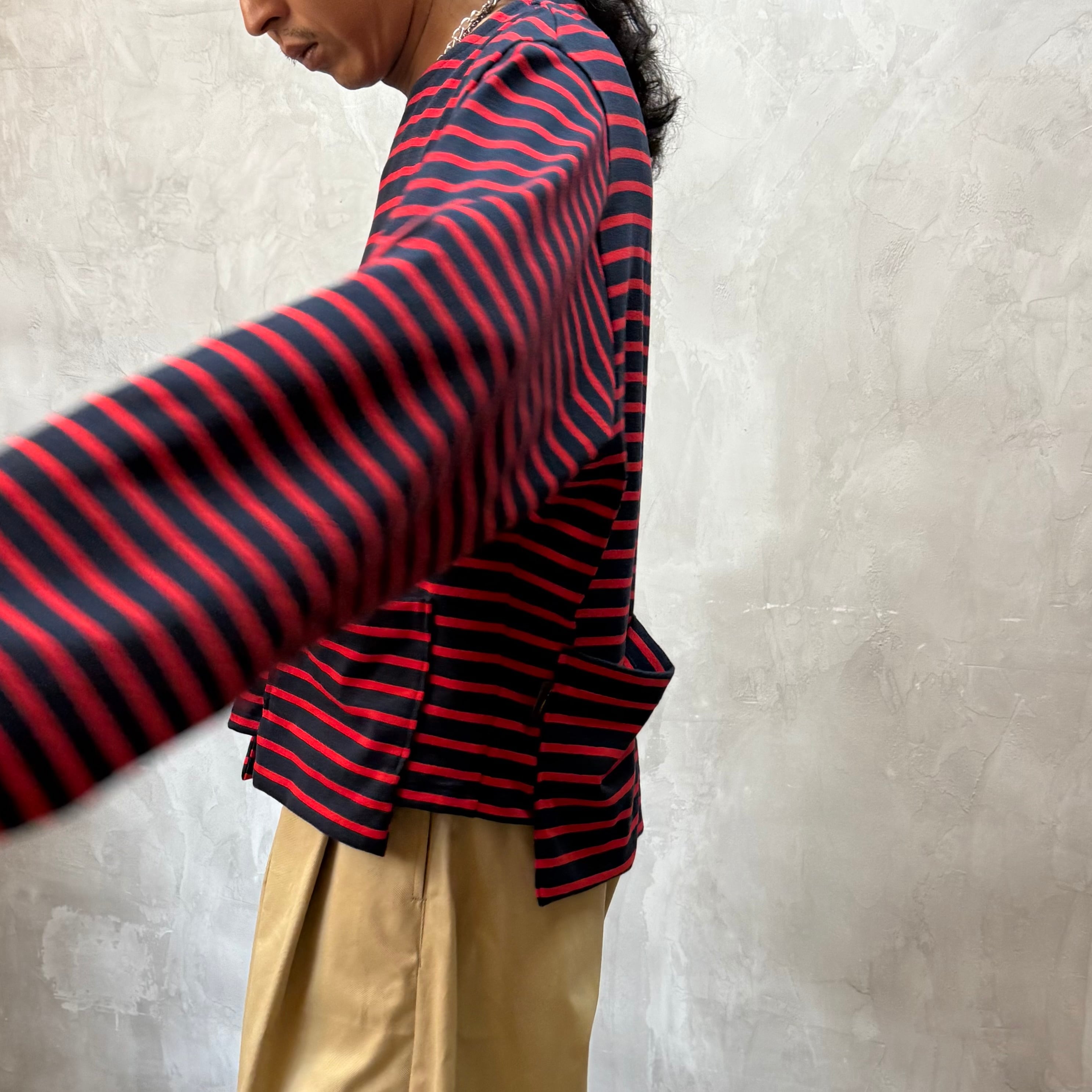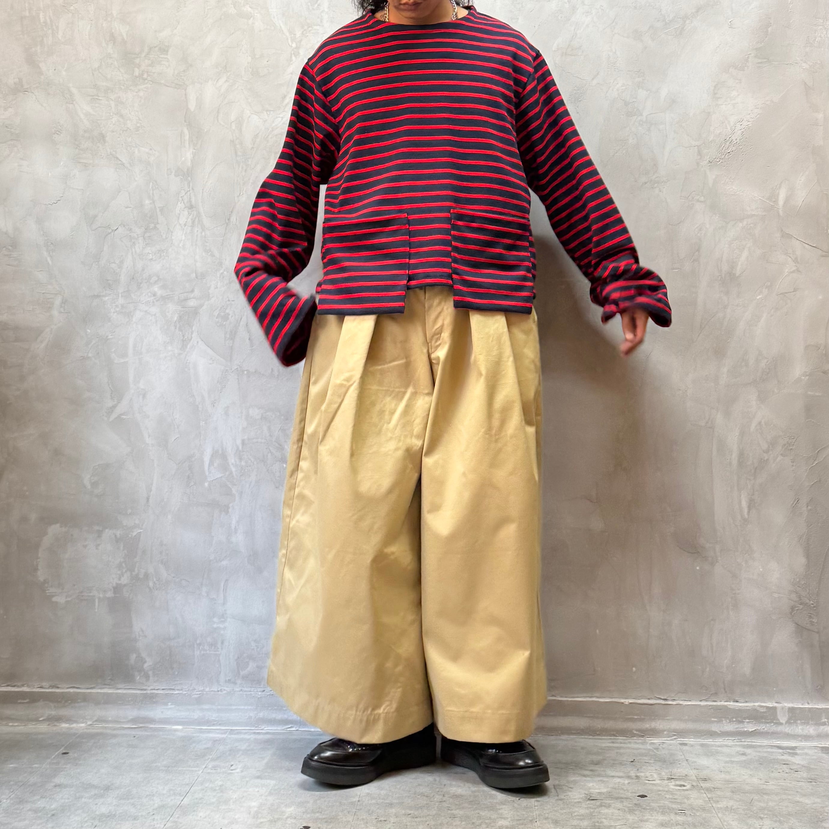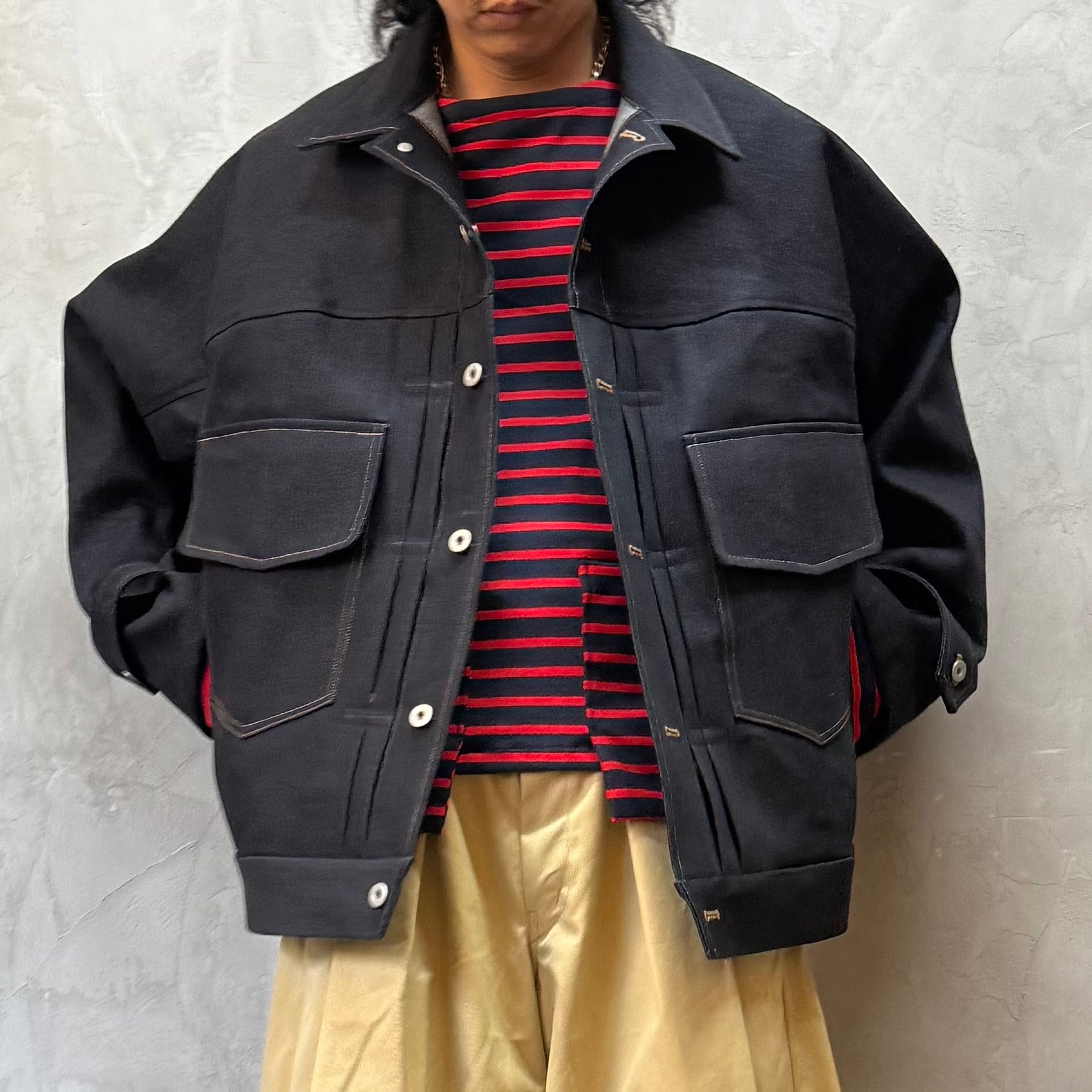 前後で裾線を越えるパッチポケットを二種配し、シンプルな中に遊びと動きを