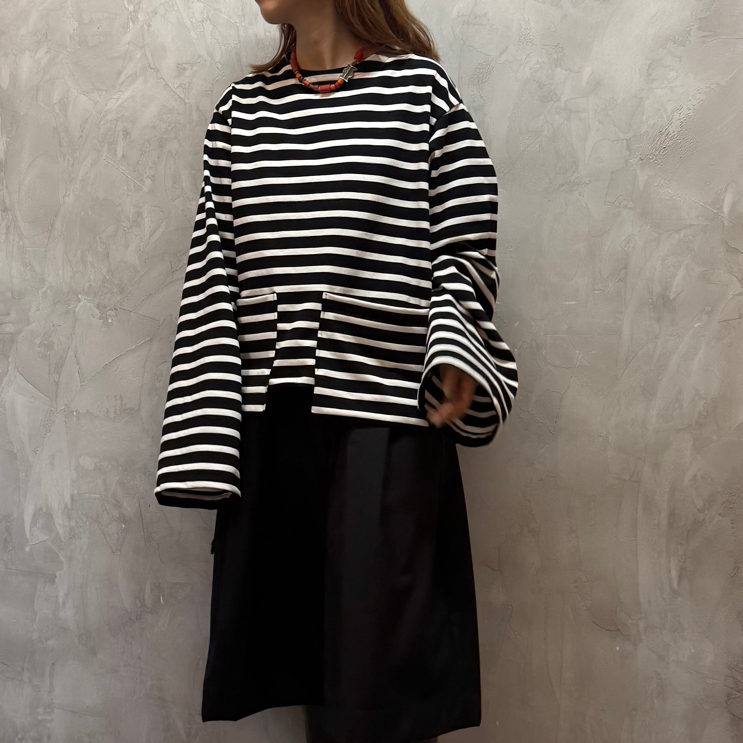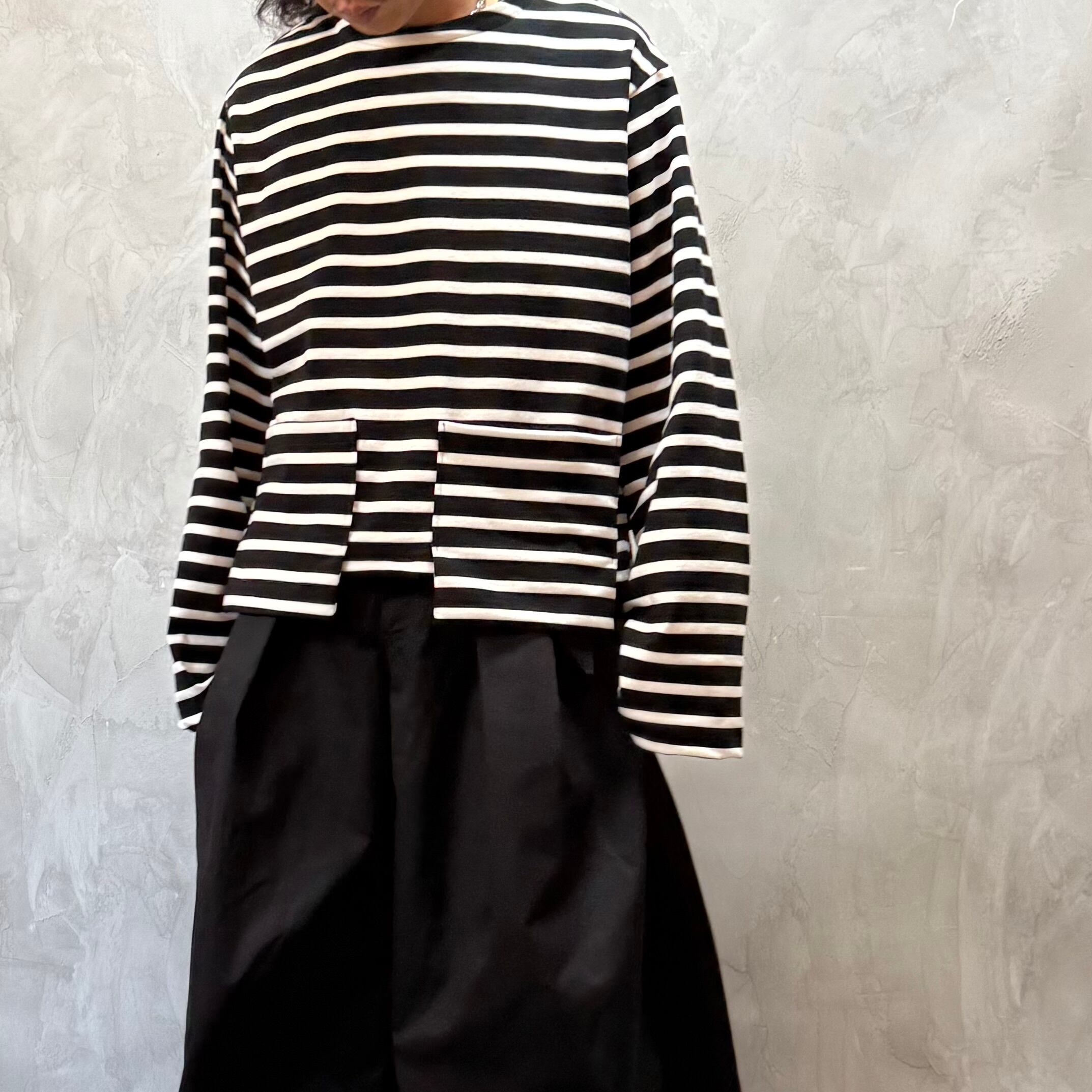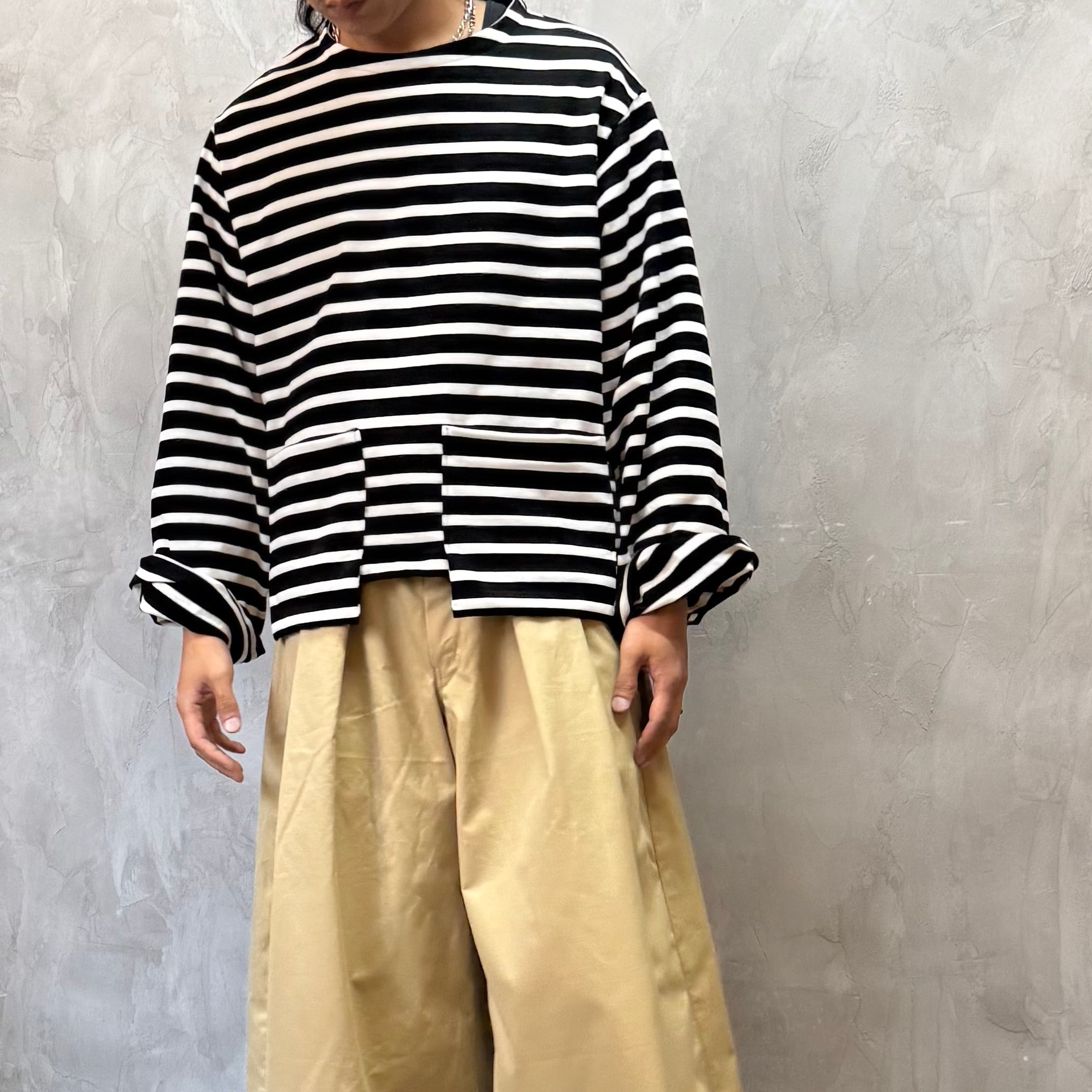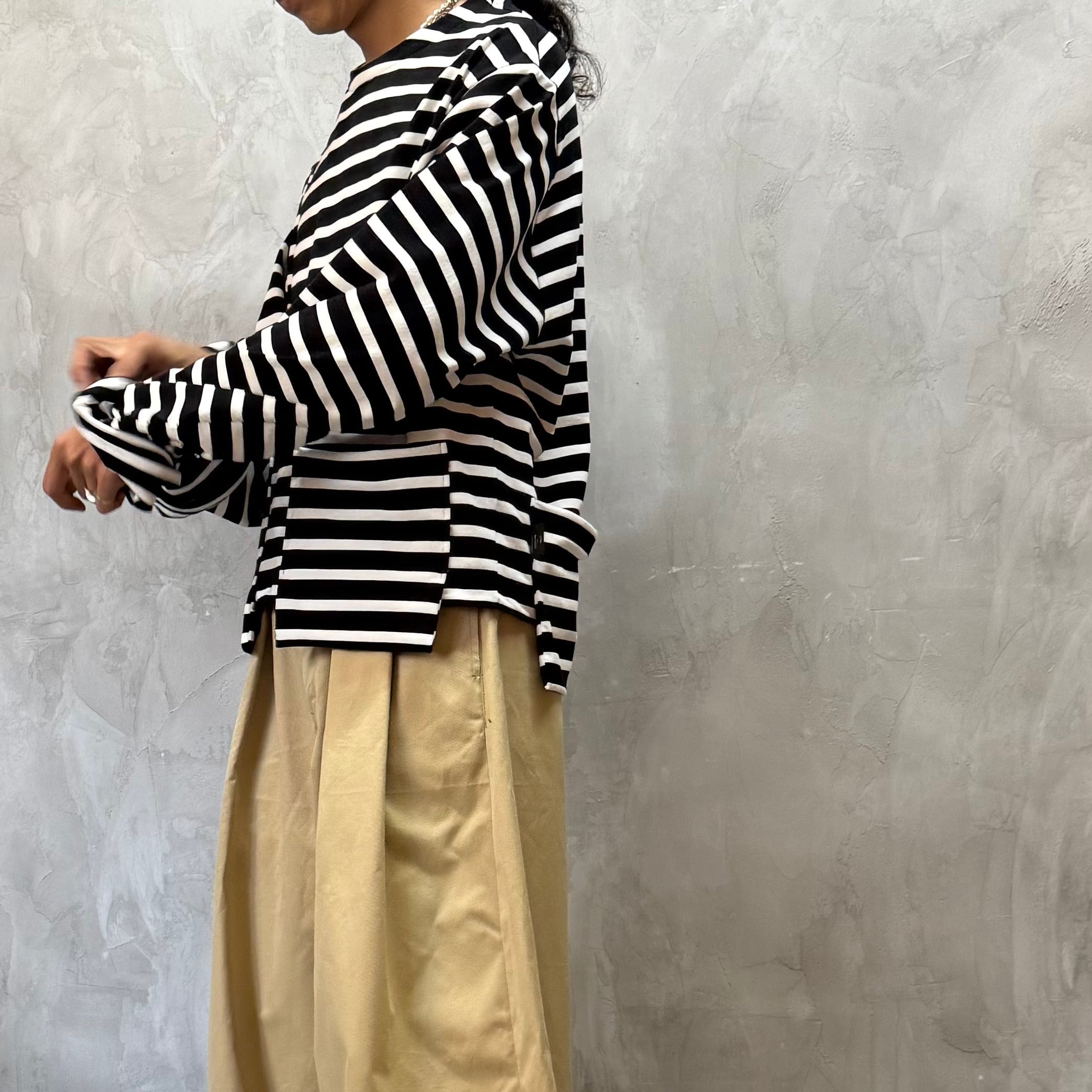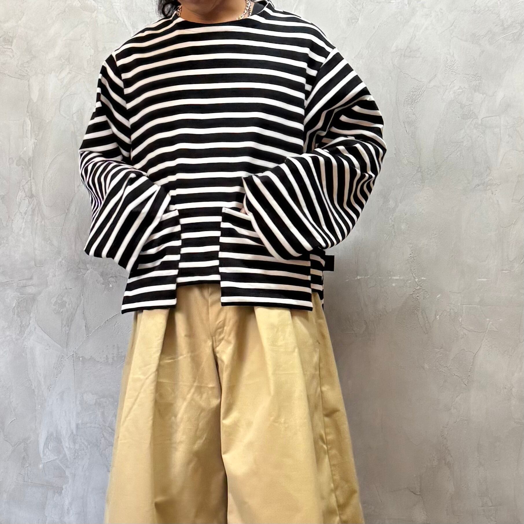 cut sew 体の線を拾い過ぎず、程よい抜け感で快適に纏える大人のバスクティー 前後で裾線を越えるパッチポケットを二種配し、シンプルな中に遊びと動きを 一枚でさらりと着るのは勿論 重ね着にも適したシルエットです 袖は敢えてだらりと長く作っています インナーや気分に委ねて大胆にロールアップしても for unisex size 着丈 約66cm 身幅 約62cm 袖丈 約66cm 着用画像 身長170cm、158cm