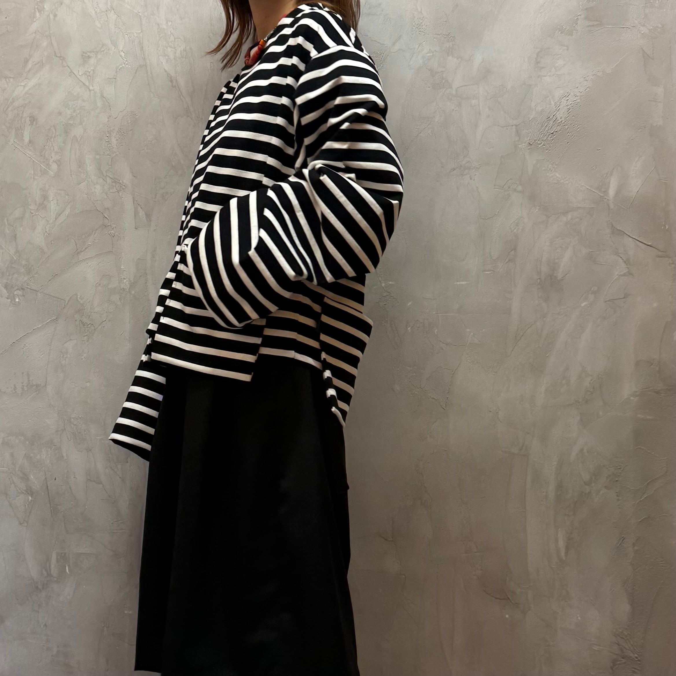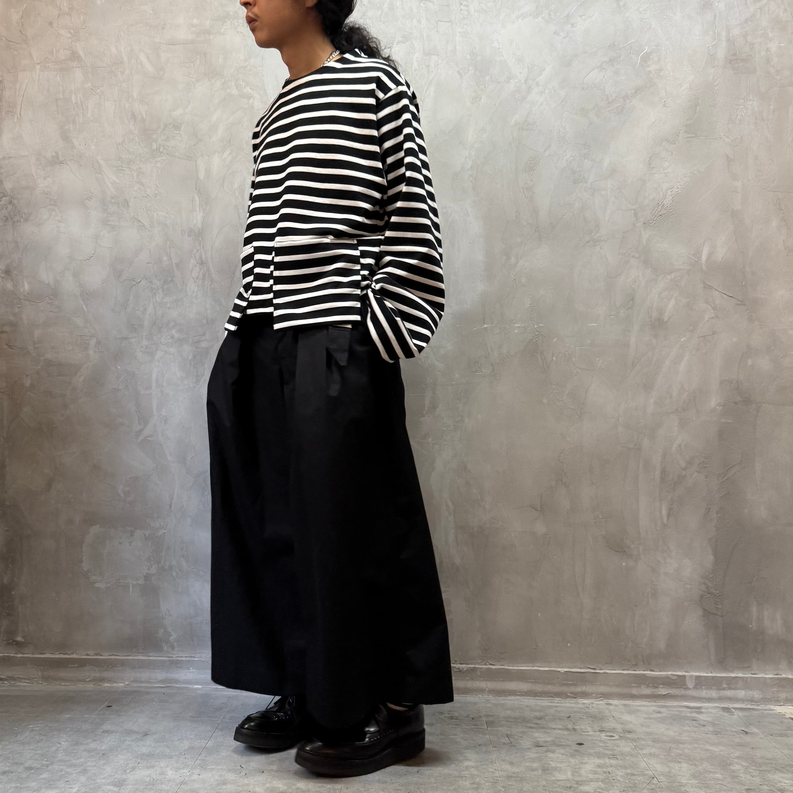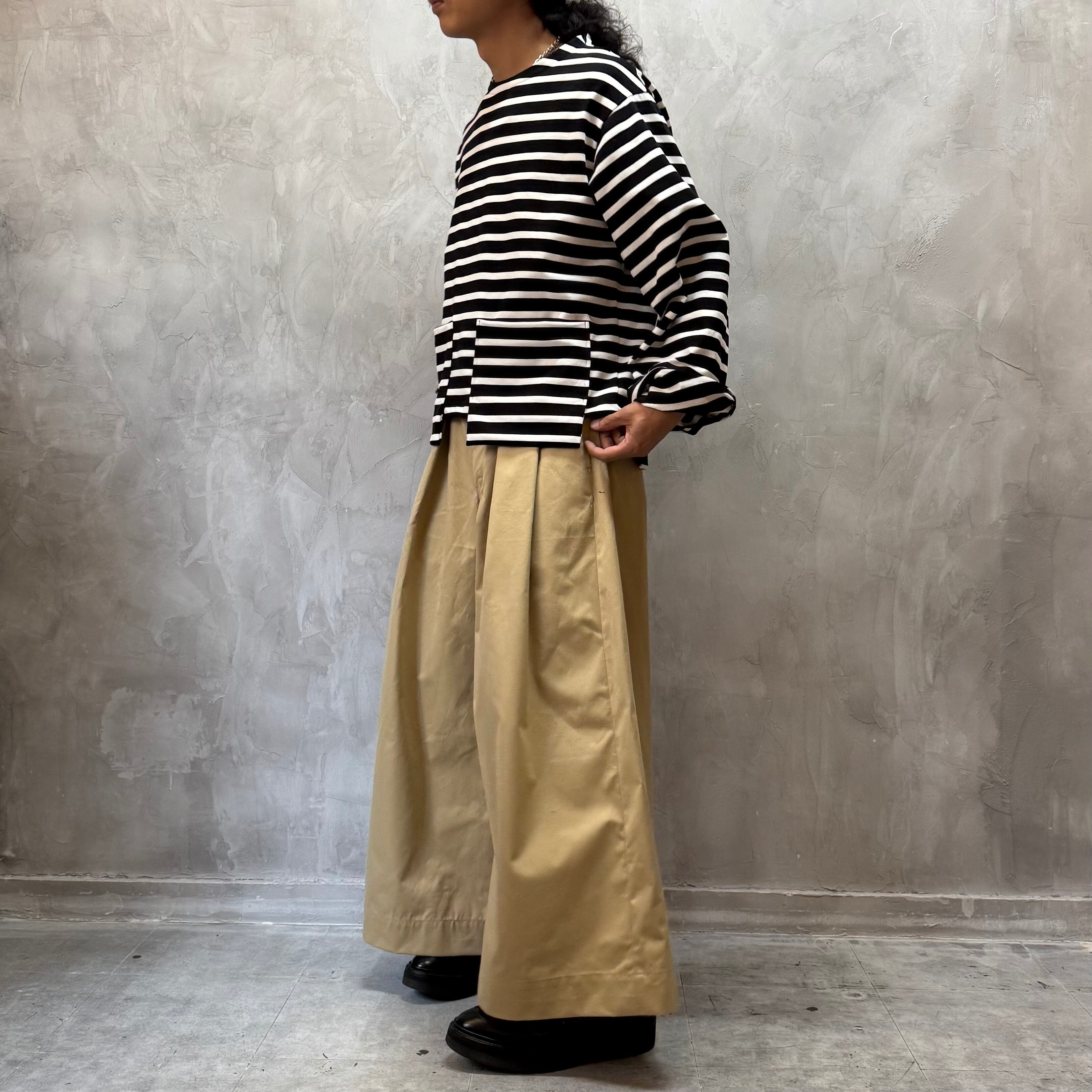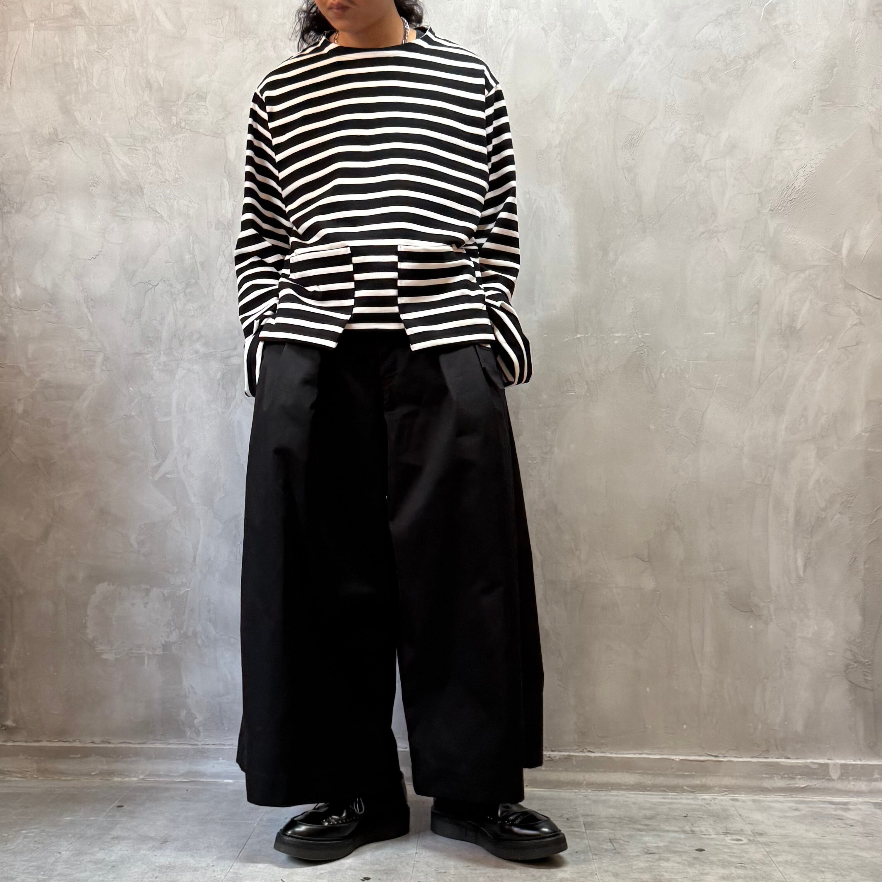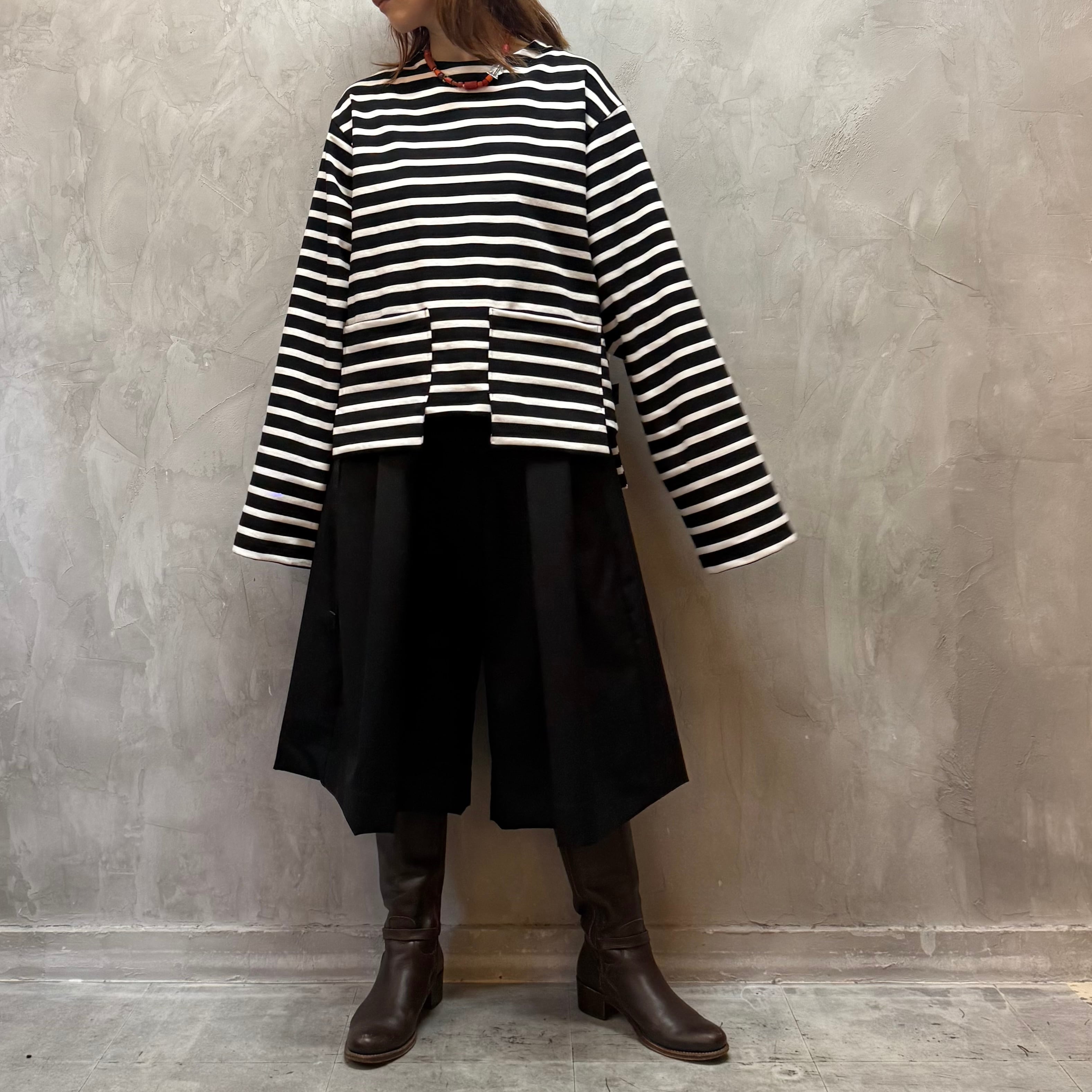cut sew 体の線を拾い過ぎず、程よい抜け感で快適に纏える大人のバスクティー 前後で裾線を越えるパッチポケットを二種配し、シンプルな中に遊びと動きを 一枚でさらりと着るのは勿論 重ね着にも適したシルエットです 袖は敢えてだらりと長く作っています インナーや気分に委ねて大胆にロールアップしても for unisex size 着丈 約66cm 身幅 約62cm 袖丈 約66cm 着用画像 身長170cm、158cm