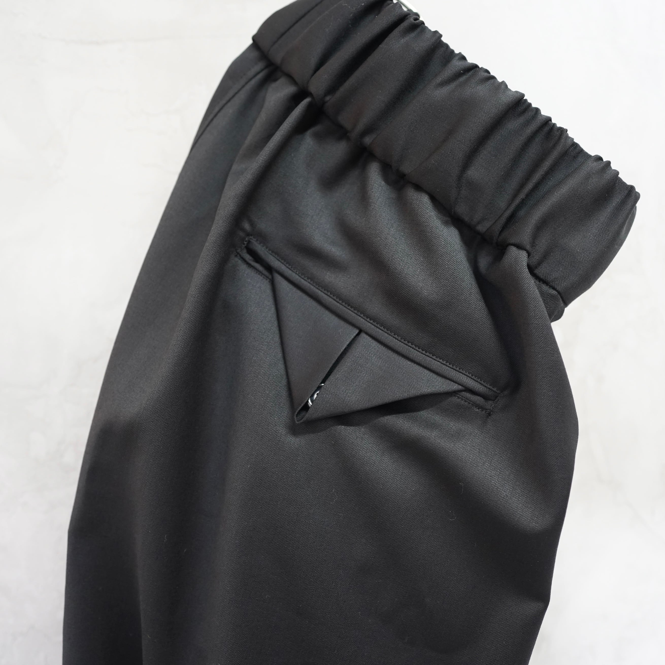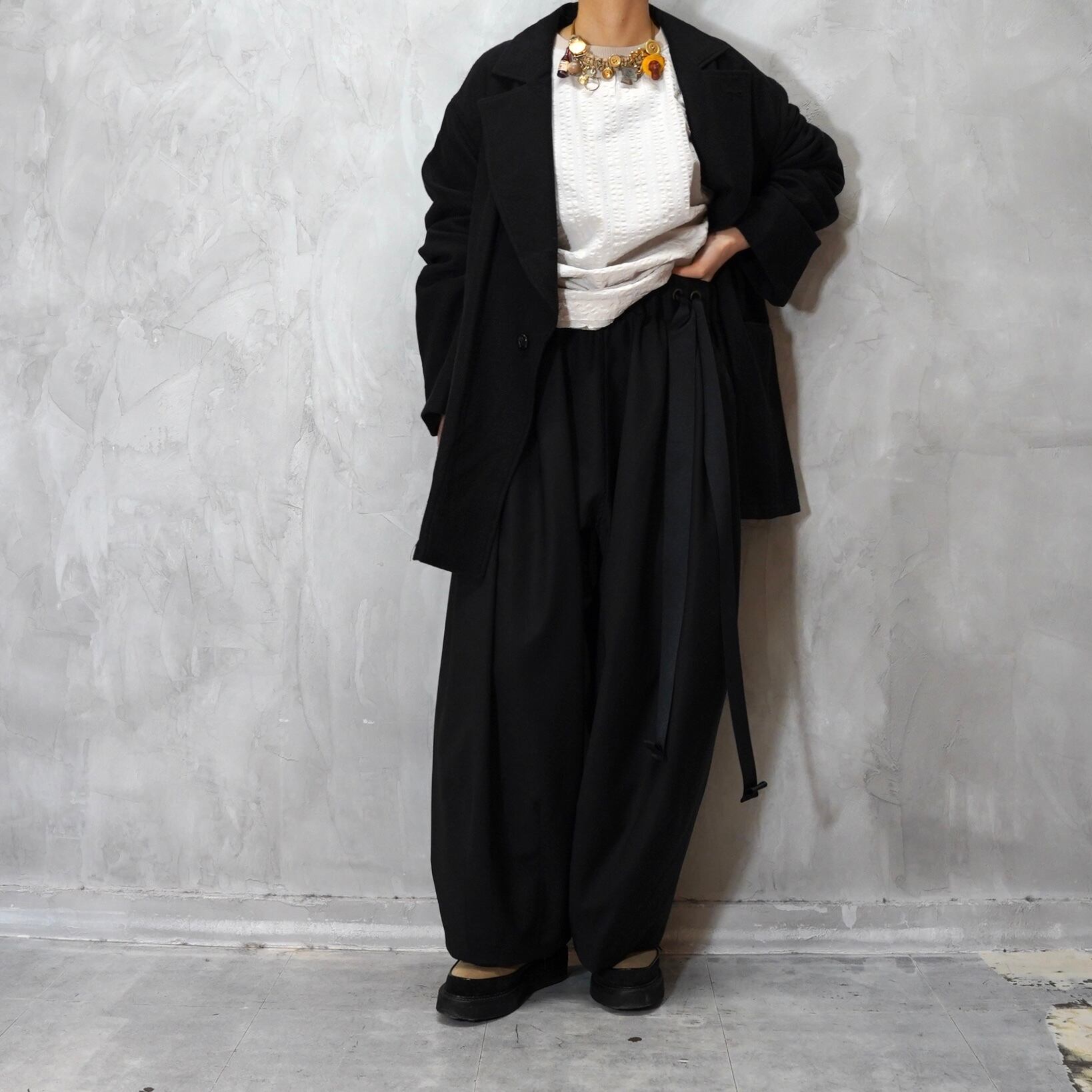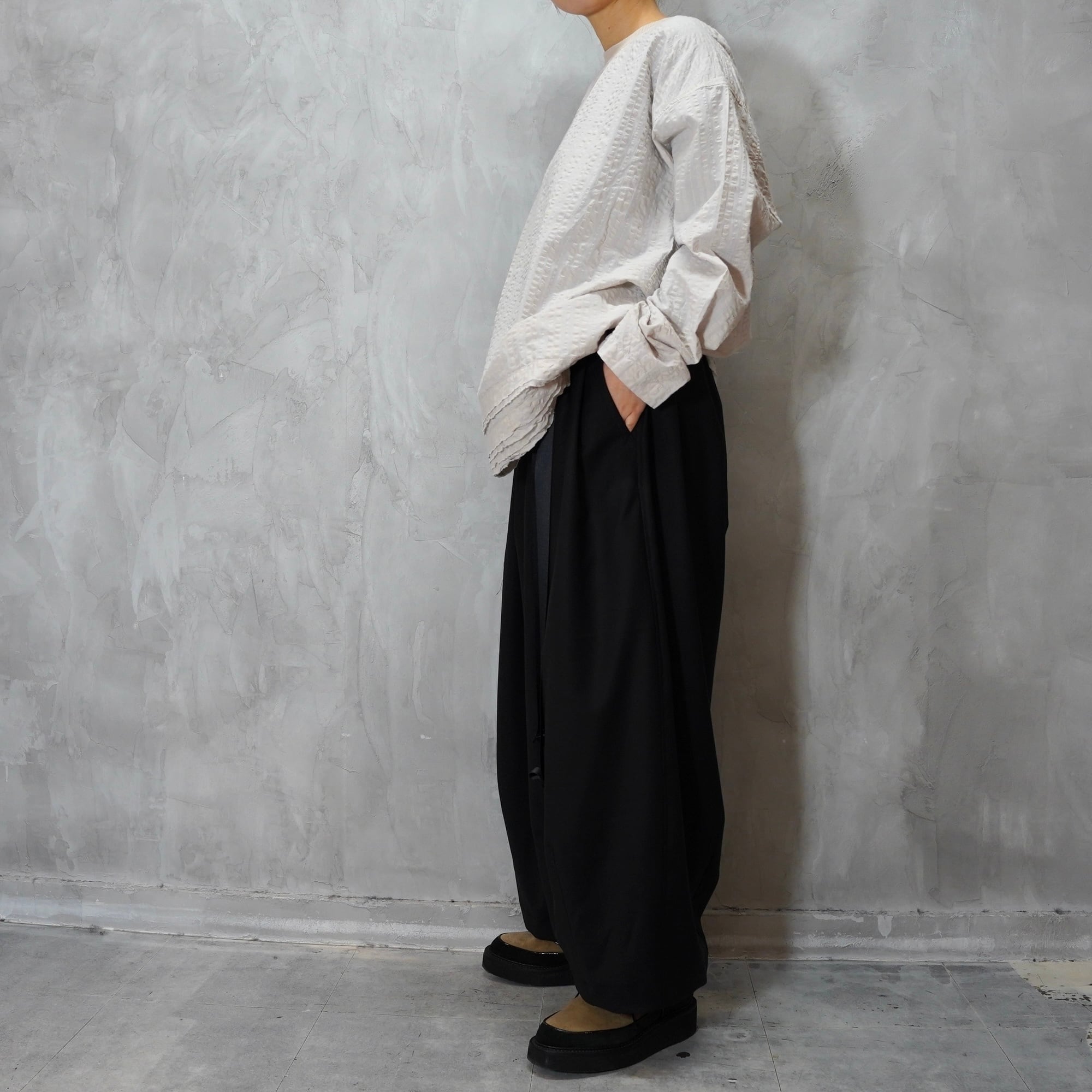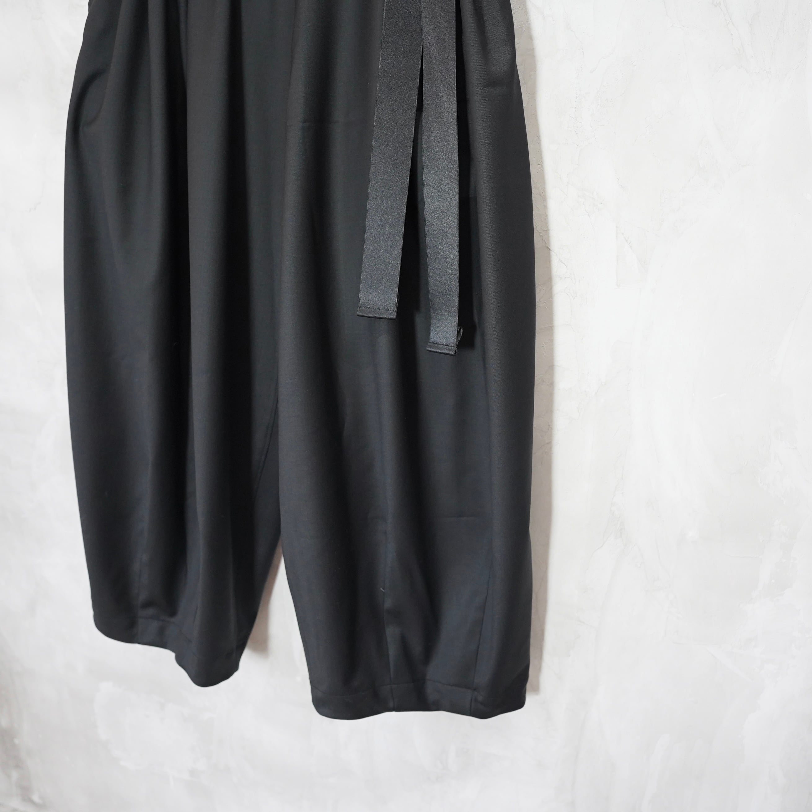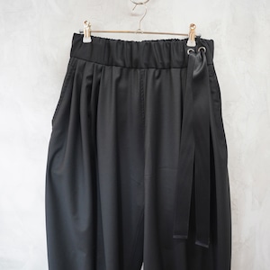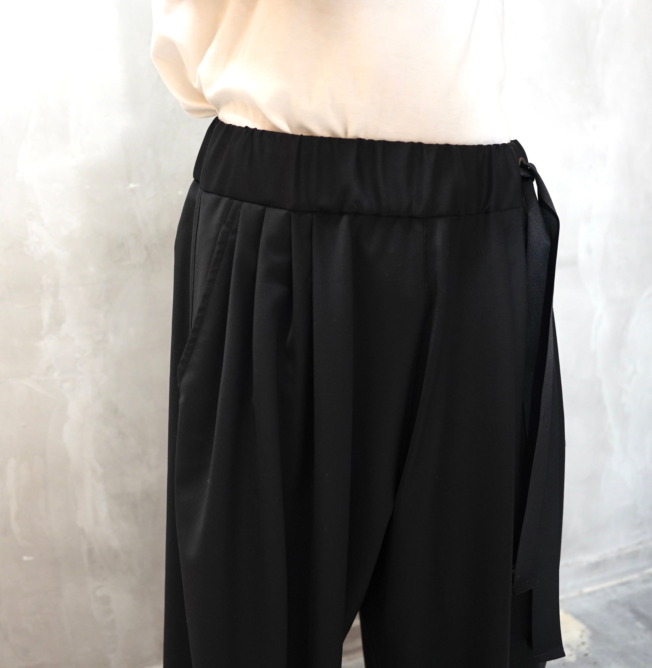 ウエストにはゴムを入れドローコードで調整し、イージーに履いていただけます。フォーマルな素材のとのギャップを楽しんで