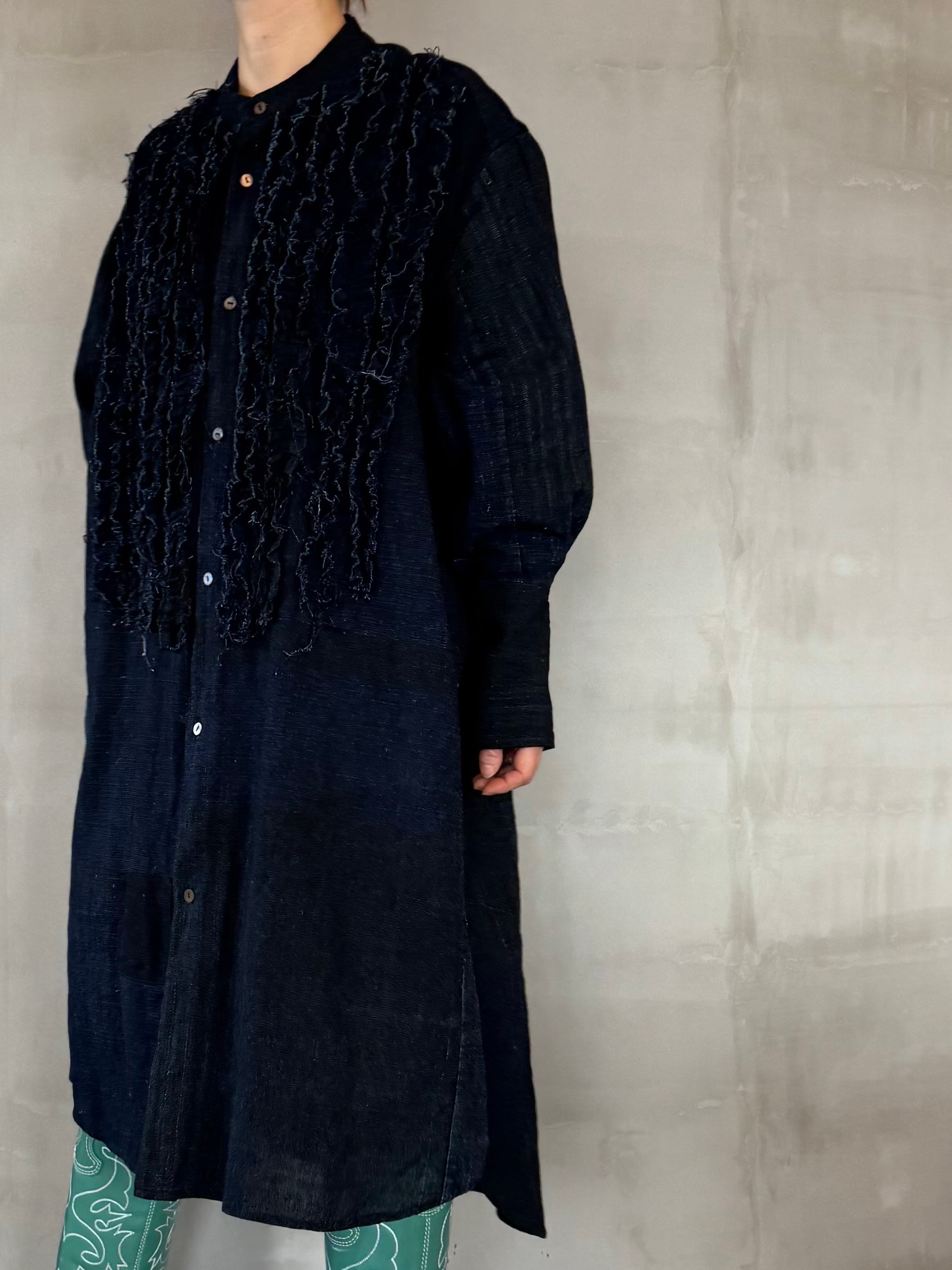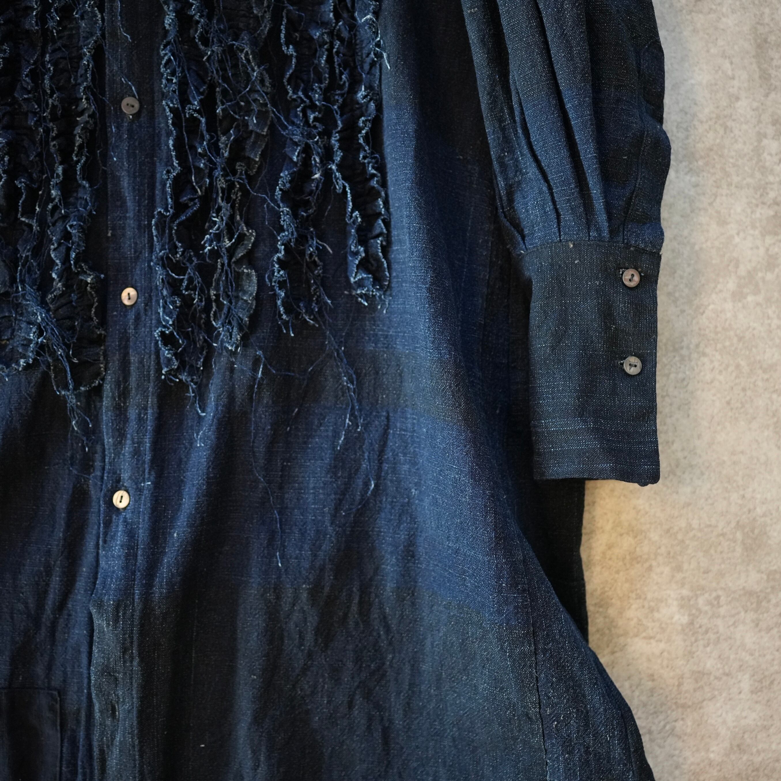 フロントいっぱいにフリルを施した贅沢なシャツワンピース。
