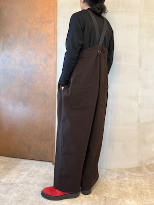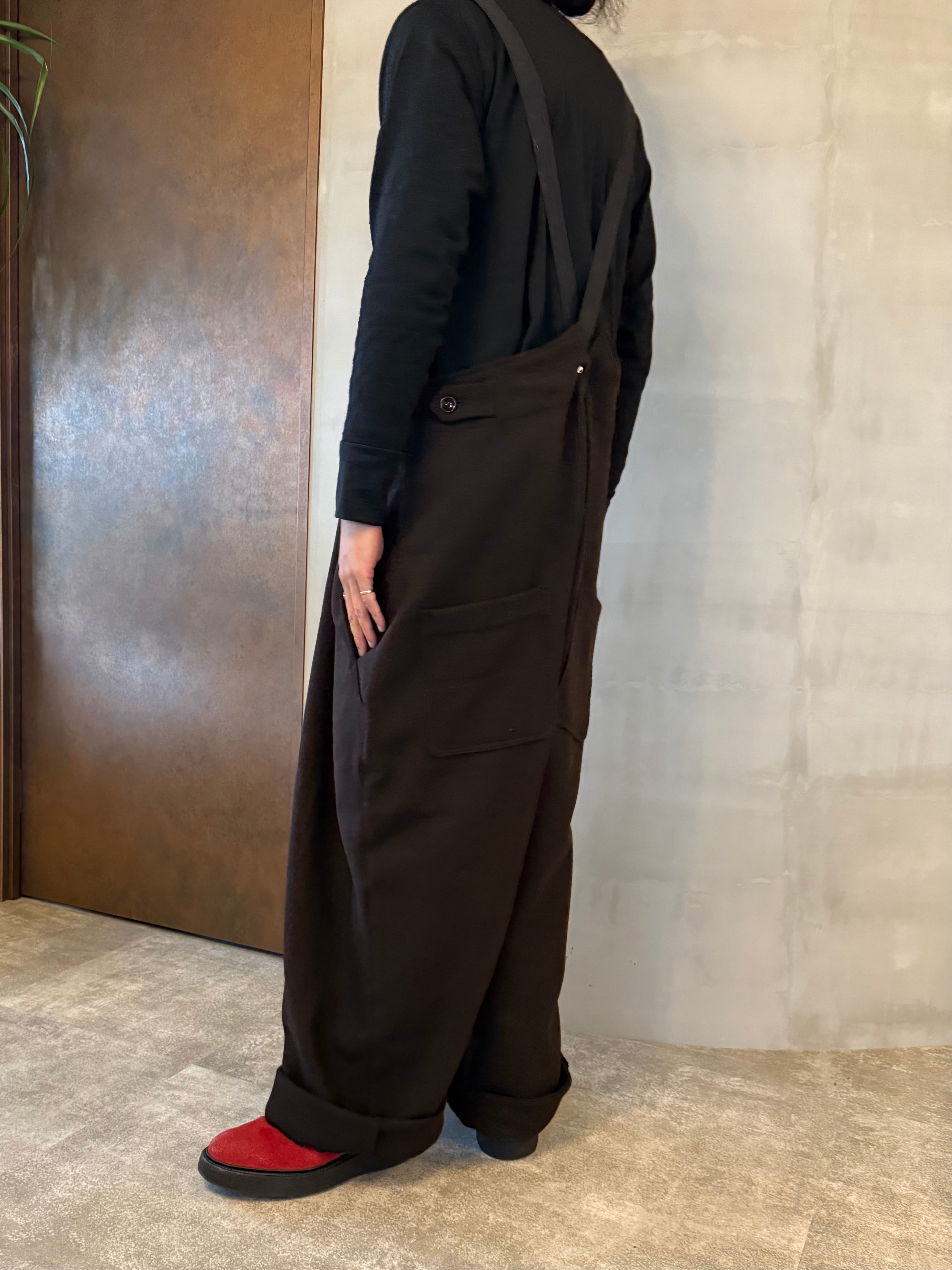 ハイウエストでサロペットのように着ることで生まれる構築的なバランス。吊りのディテールがつくる抜け感を存分に楽しめます。