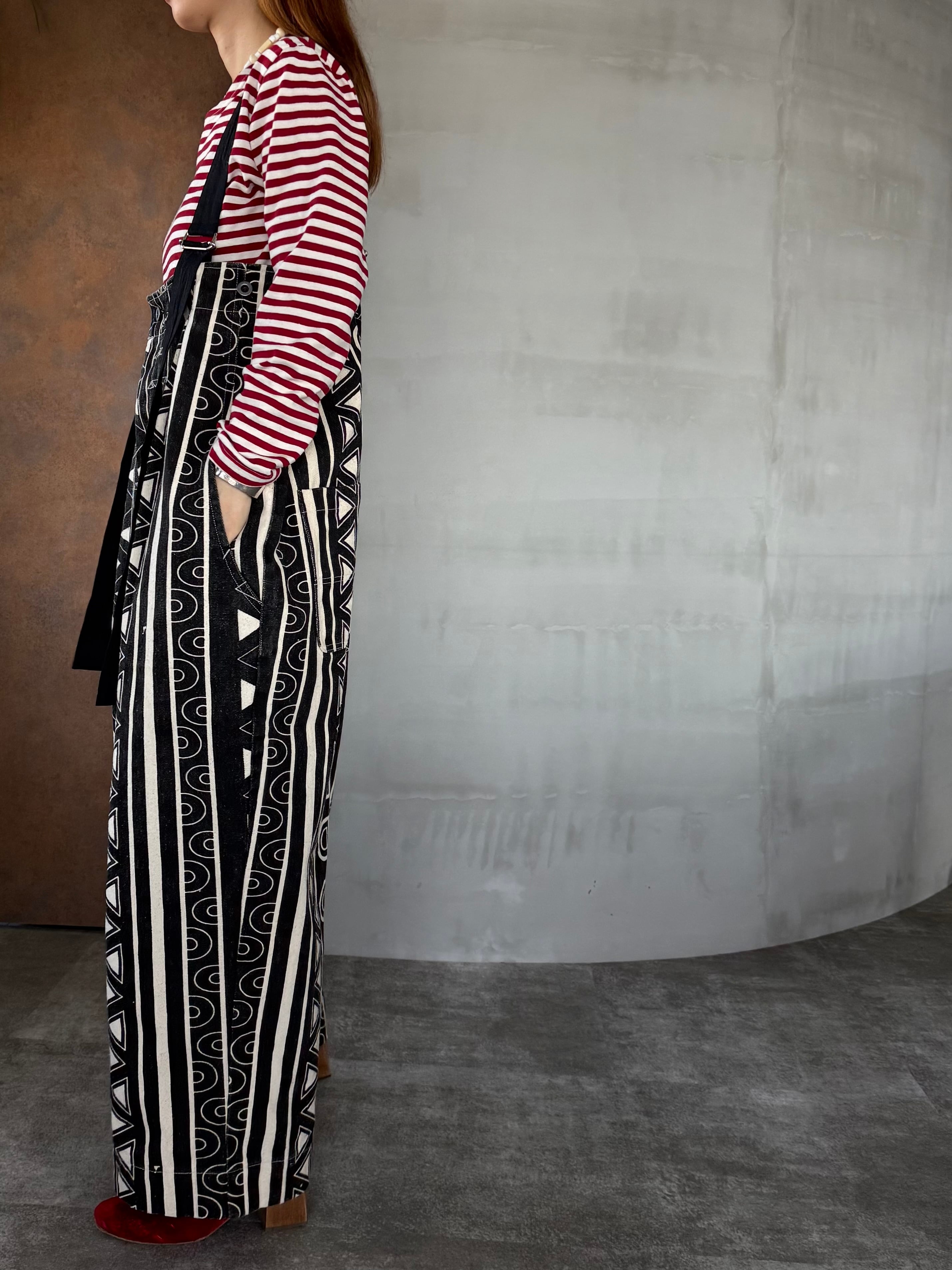 胸辺りまで上げてサロペットのように着ることで生まれる構築的なバランス。吊りのディテールがつくる抜け感を存分に楽しめます。